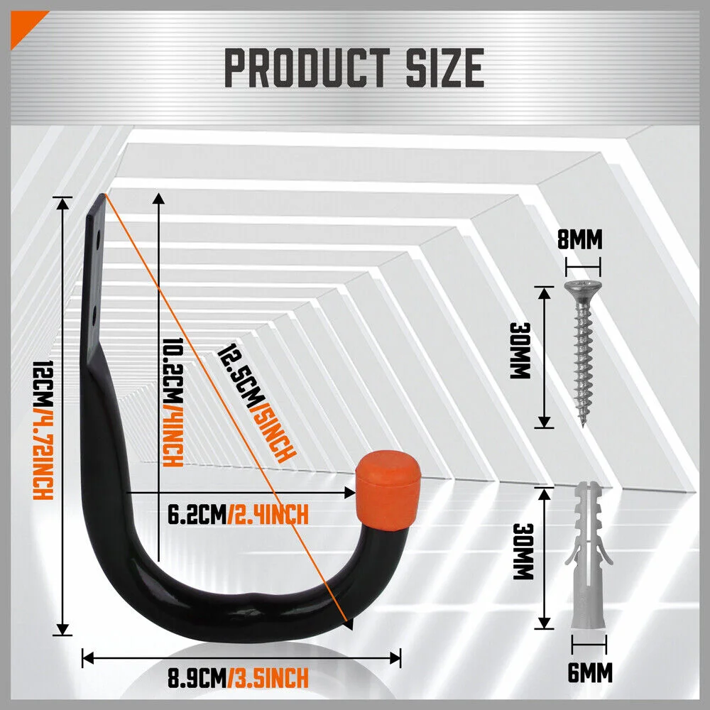 6 pack garage storage hooks with 12pcs screws and anchors, hook size: 4.72in x 3.5in(L x W).