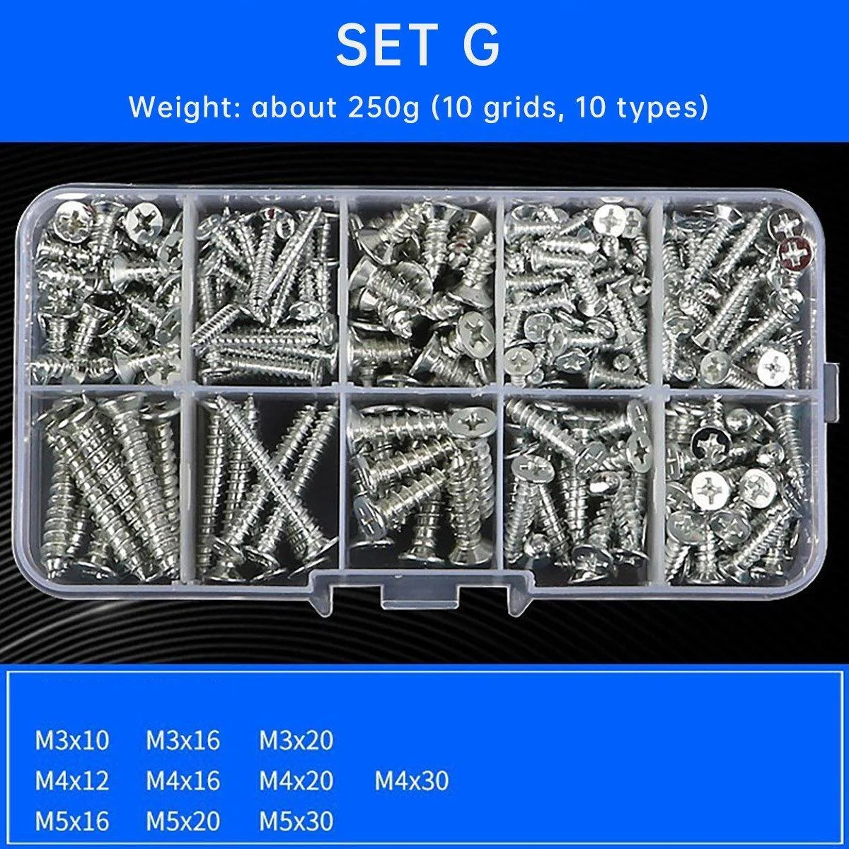 Comprehensive Fastener Selection: Offers a complete assortment of screws, nuts, washers, and self-tapping screws for diverse applications.