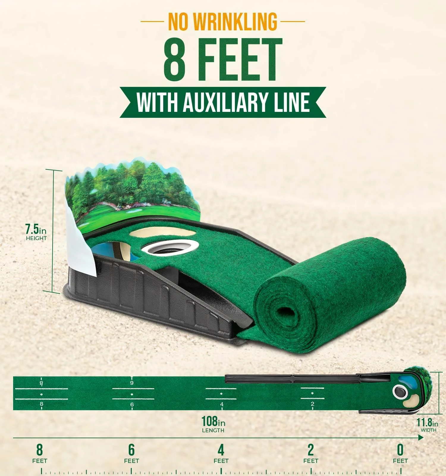 Perfect your short game anytime, anywhere with this premium indoor putting green designed to replicate true course conditions. Featuring a smooth, wrinkle-resistant surface that delivers a consistent 10 mph Stimp speed, it provides realistic roll feedback to help you master distance control and line accuracy. The automatic ball return system lets you practice continuously without bending overideal for high-repetition training. Built-in sand bunker and water hazard obstacles sharpen focus and simulate real-course pressure, while four distance markers (2ft to 8ft) guide progressive skill development. Alignment guides assist beginners in learning proper stance, face angle, and swing path. Compact yet full-length, it fits seamlessly in living rooms, home gyms, basements, offices, or golf simulators. Beyond training, it doubles as a fun party game or stress-relief activity during breaks. Includes two regulation golf balls for immediate use. Whether you're preparing for tournament play or enjoying casual practice on rainy days, this mat keeps your putting sharp year-round.
