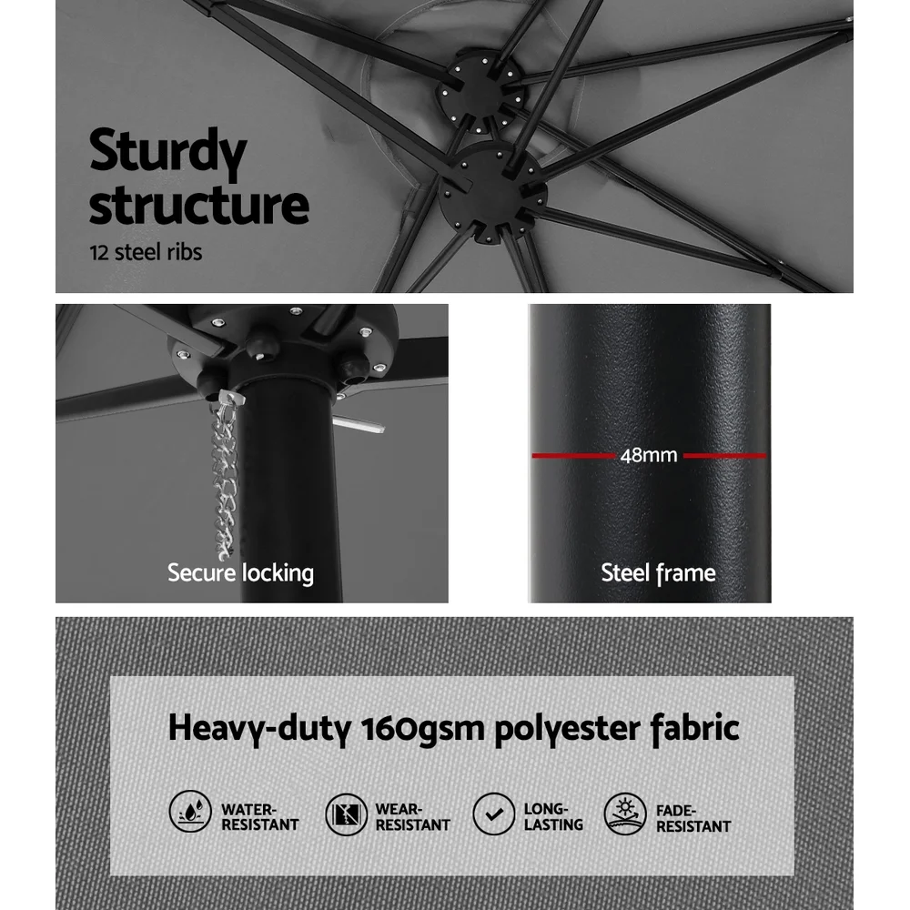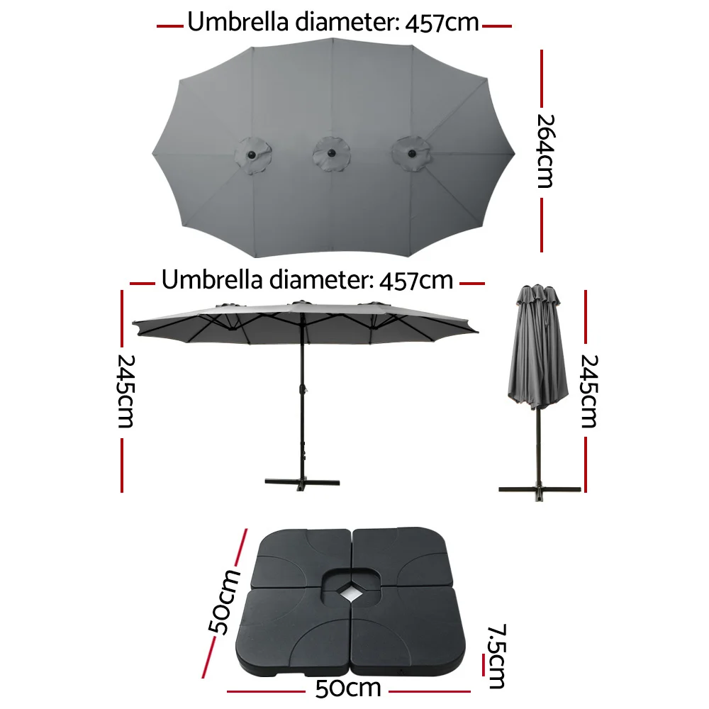 It can be hard trying to fit everyone under one roof. Now you never have to worry about space again thanks to the Instahut Twin Outdoor Umbrella. This extra-large patio umbrella is perfect for summer picnics, BBQs or family beach days, thanks to its 4.57m diameter and double-sided canopy. Made from UV+50, 3-layer, water-resistant and UV-resistant polyester fabric and with the support of 12 steel ribs, the canopy will last you through all kinds of weather. It is easily operated by hand using the heavy-duty, fail-safe handle supported by a powder-coated steel pole and durable steel base. Secure your brand-new umbrella with an Instahut Umbrella Base. Featuring a sturdy 4-plate design constructed from heavy-duty HDPE plastic, the stand is built to withstand moderate gusts of wind and is anti-fade. To use, simply fill with water through the fill spout and insert your umbrella. When fully filled, each piece weighs approximately 15kg, giving you a combined weight of 61.61kg. Use in a 2, 3 or 4-plate configuration to best suit your needs. When the day is done, simply empty the plates and carry them home with the convenient carry handles. Enjoy the outdoors to the fullest with an Instahut Umbrella and Base Set.
