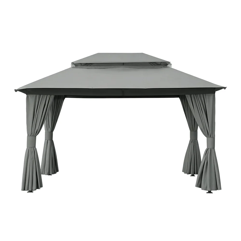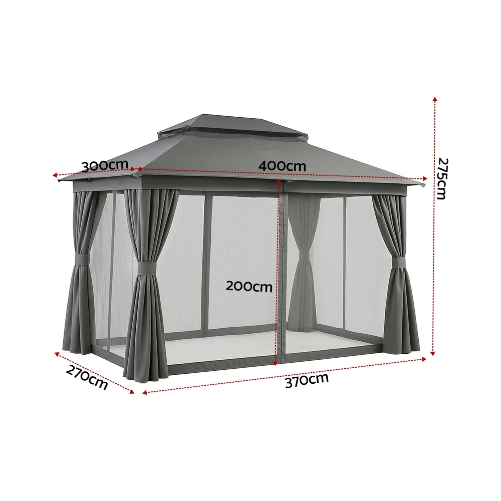 Keep comfortable outdoors year-round with this sturdy Instahut gazebo. Its ventilated double-roof design promotes airflow while the UV-resistant, water-resistant top protects from harsh Aussie sun and light rain. Features practical 8 water leakage holes to prevent pooling. Enjoy bug-free relaxation with full removable flyscreens and curtains, thanks to the dual-track system and double-sided zippers. The heavy-duty powder-coated steel frame ensures stability, while convenient hanging hooks and hook & loop attachments add versatility. Mosquito-proof mesh walls provide reliable insect protection. Sets up to a spacious footprint in classic grey. Constructed from durable steel and polyester.