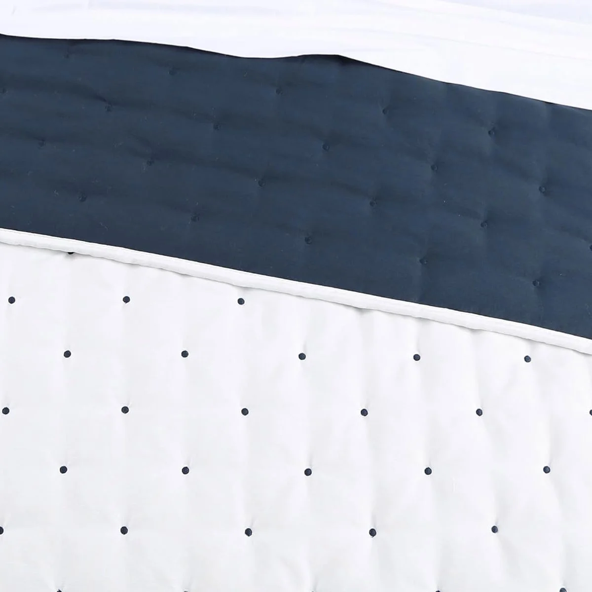 The Jenny Mclean Swiss Dots Blue 3 Piece 100% Cotton Embroidered Reversible Coverlet Set inspired by stitching techniques, Embroidered Swiss Dot features a small navy dot stitch on white, reversing to a small white dot stitch on navy with a bound border.