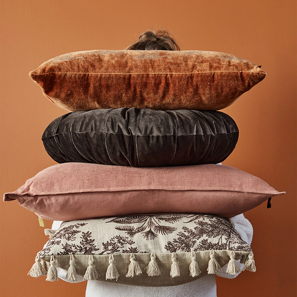 Decorative cushion KAAT Amsterdam Mandarin Brown Round Filled Cushion 40cm Diameter is a must-have for any interior. The cushion has a striking round shape with a covered button in the middle. Made from velvet polyester in a beautiful shade of brown this contemporary cushion will add a touch of luxury to your interior. The decorative cushion Mandarin is made from polyester and the backing is plain dyed cotton fabric and with a diameter of 40 cm. The cushion comes with a resilient polyester inner cushion. The cushion cannot be washed in the washing machine and is not suitable for tumble drying.