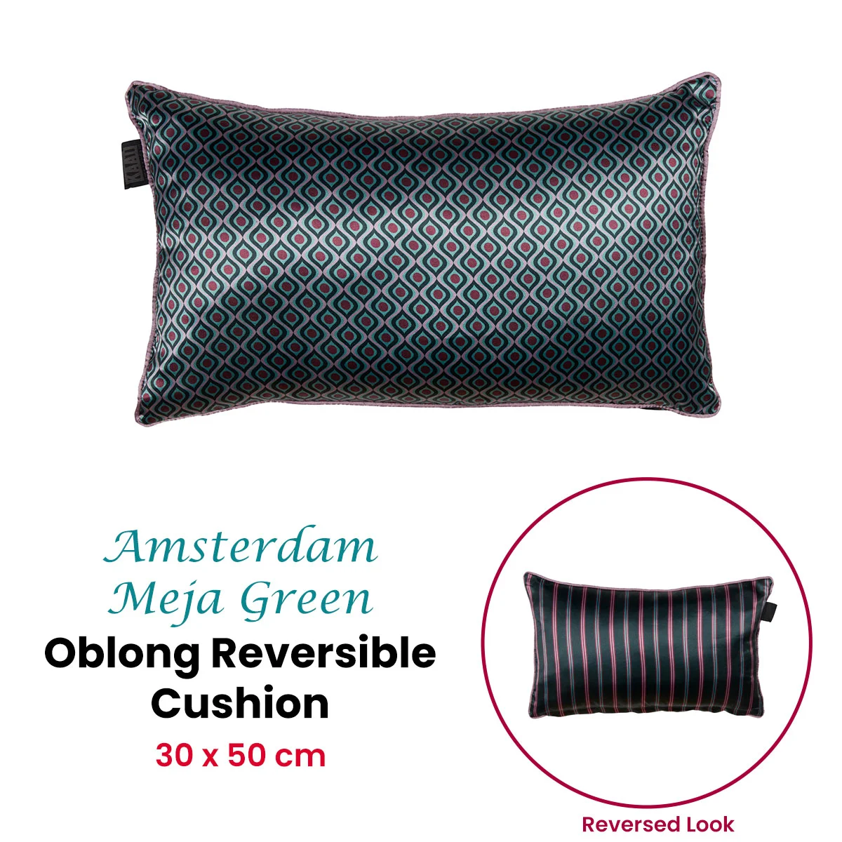Give your interior a retro touch with the KAAT Amsterdam Meja Green Reversible Oblong Filled Cushion 30cm x 50cm. The decorative cushion has a satin look, retro motifs on the front in pink, green, sage, and plum hues, and colourful stripes on the back. The side is neatly finished off with purple edging. This decorative cushion is available in different colour combinations. Decorative cushion Meja is made of 100% polyester satin. The size is 30 x 50 cm. The cushion has a zipper at the bottom and comes with a resilient polyester inner cushion. Nice detail: the cushion has a golden puller at the zipper in the shape of an Amsterdam canal house. The cushion is is not suitable for machine washing or tumble drying.