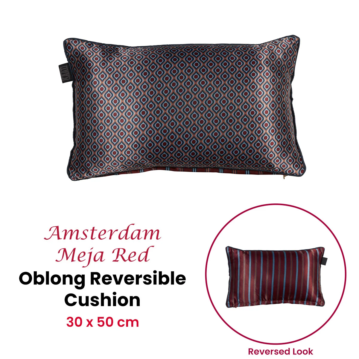 Give your interior a retro touch with the KAAT Amsterdam Meja Red Reversible Oblong Filled Cushion 30cm x 50cm. The decorative cushion has a satin look. Retro motifs are depicted on the front of the cushion in dark green, burgundy, sage, and brown hues. The back consists of colourful vertical stripes. The side is neatly finished off with a dark blue edging. This decorative cushion is available in different colour combinations. Decorative cushion Meja is made of 100% polyester satin. The size is 30 x 50 cm. The cushion has a zipper at the bottom and comes with a resilient polyester inner cushion. Nice detail: the cushion has a golden puller at the zipper in the shape of an Amsterdam canal house. The cushion is is not suitable for machine washing or tumble drying.