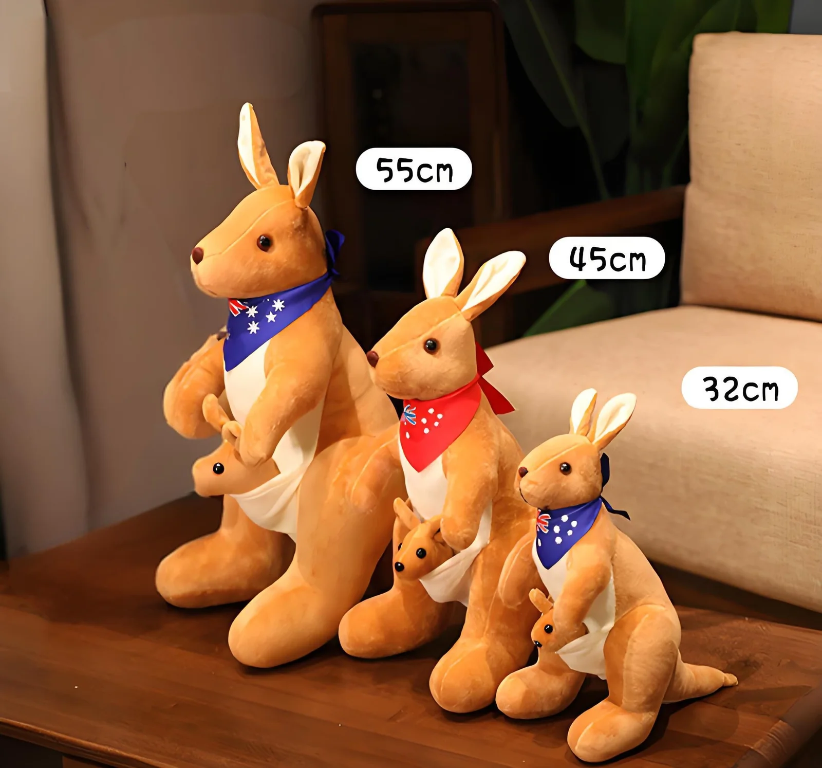 The toys adorable design features a classic Australia-themed scarf wrapped around the mother kangaroos neck, adding a touch of authentic down-under flair, while the baby joey peeks out from her pouch for an extra dose of cuteness. Unlike loose plush accessories, the joey is securely sewn to the mothers pouch, ensuring it never gets lost and boosting the toys long-term durability for years of play.
