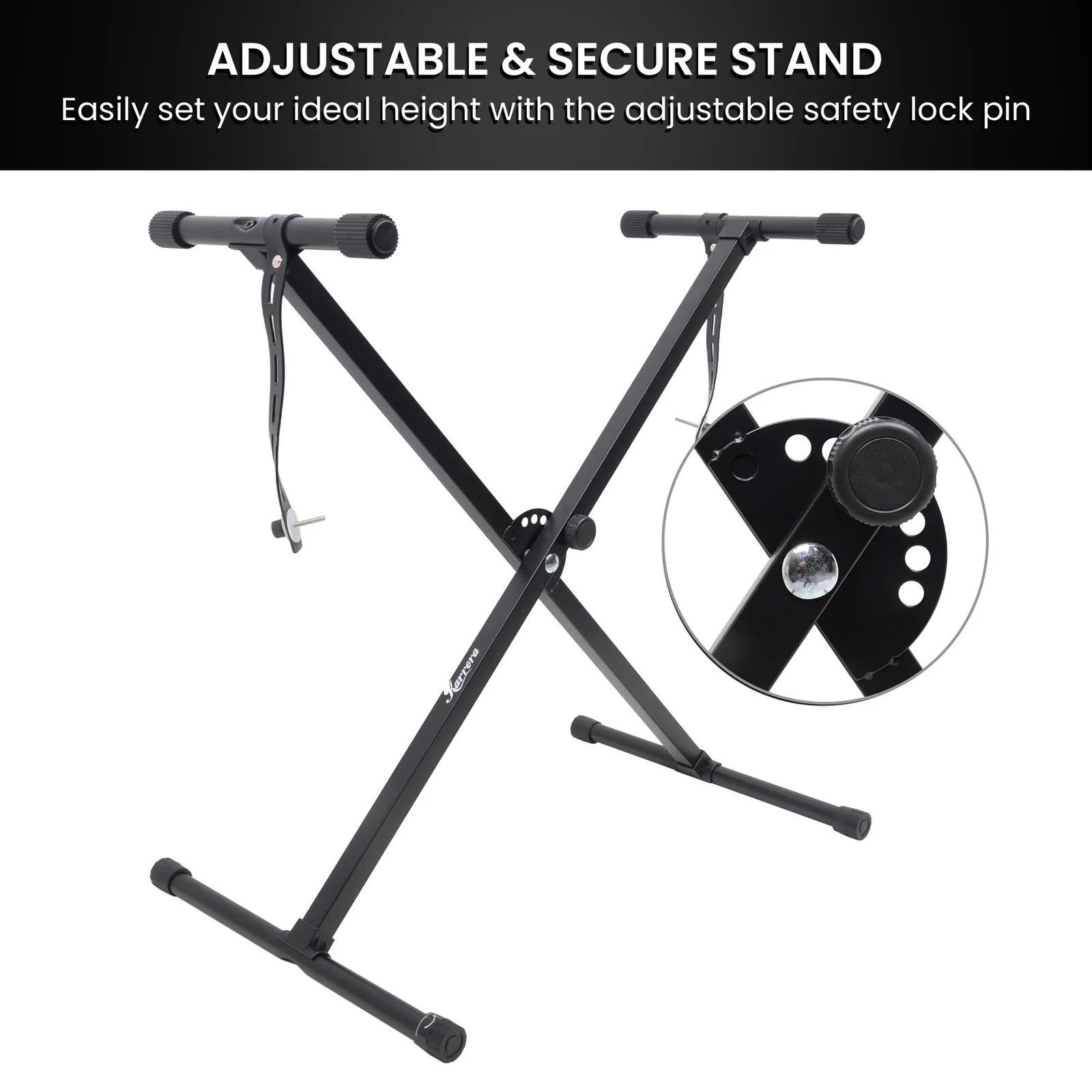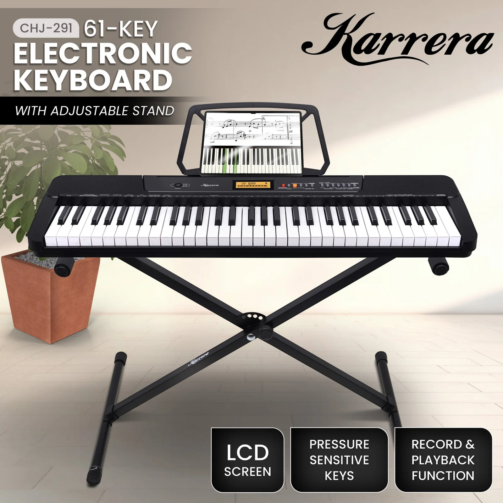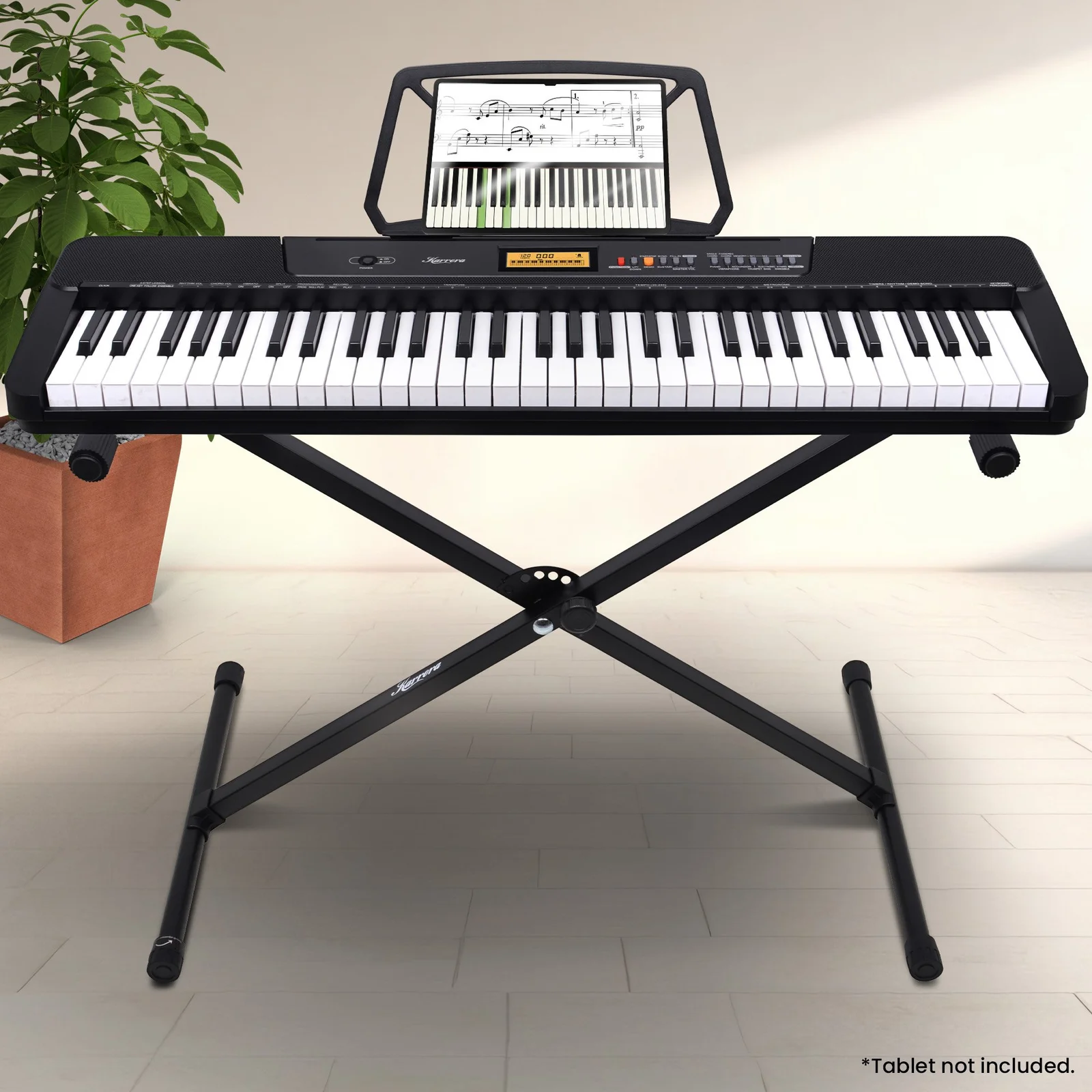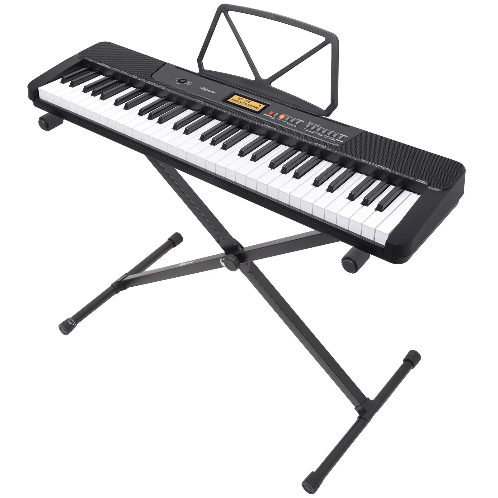 - Music sheet holder and adjustable stand included