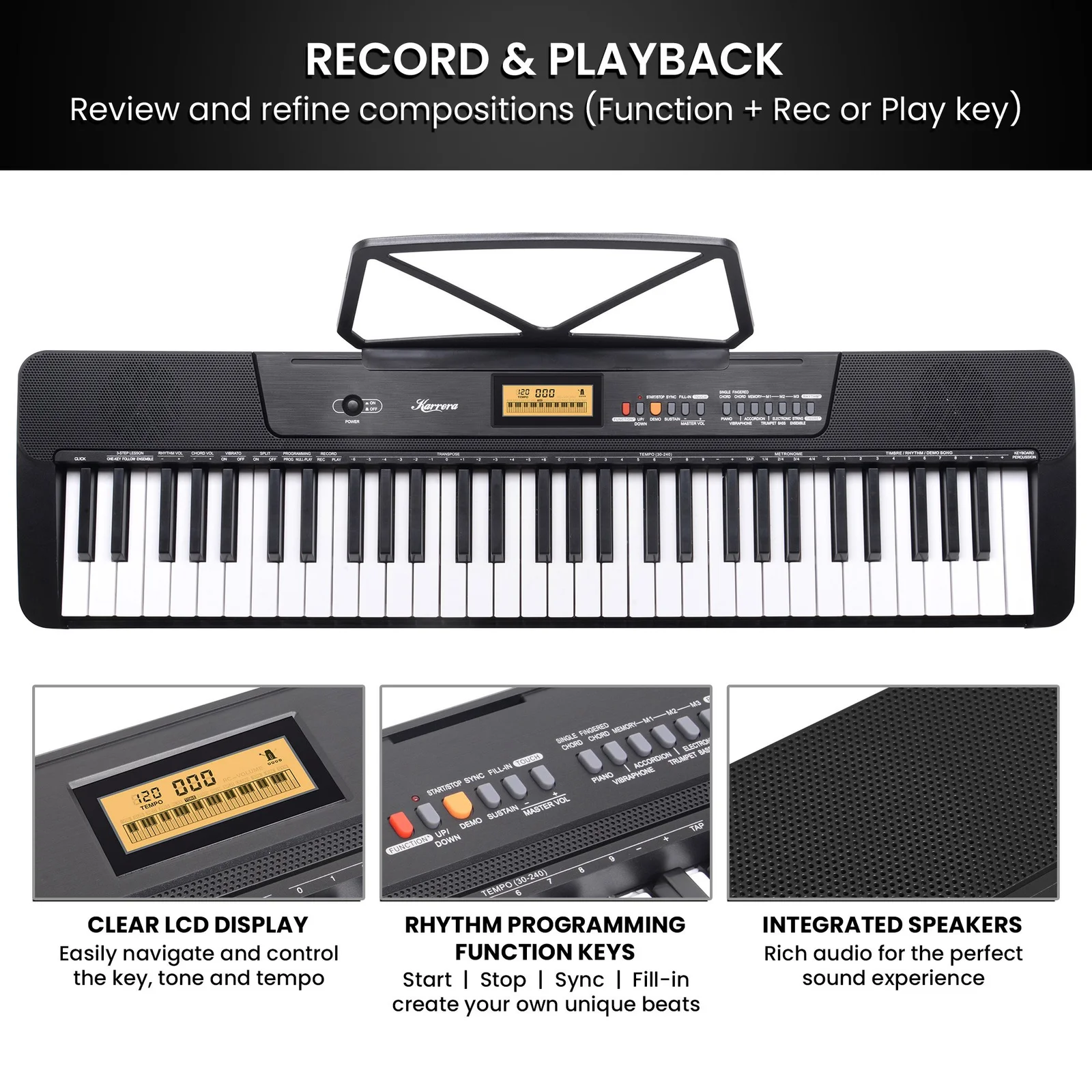 Get creative with the rhythm programming feature, which lets you create your own beats to go along with your music. Plus, the 6-voice direct selection gives you quick access to a bunch of different tones, making your music even more versatile. Whether youre just starting out, composing or putting on a show, this keyboard strikes the perfect balance between fun and function. Discover your unique sound with Karreras electronic keyboardyour go-to partner for musical expression!