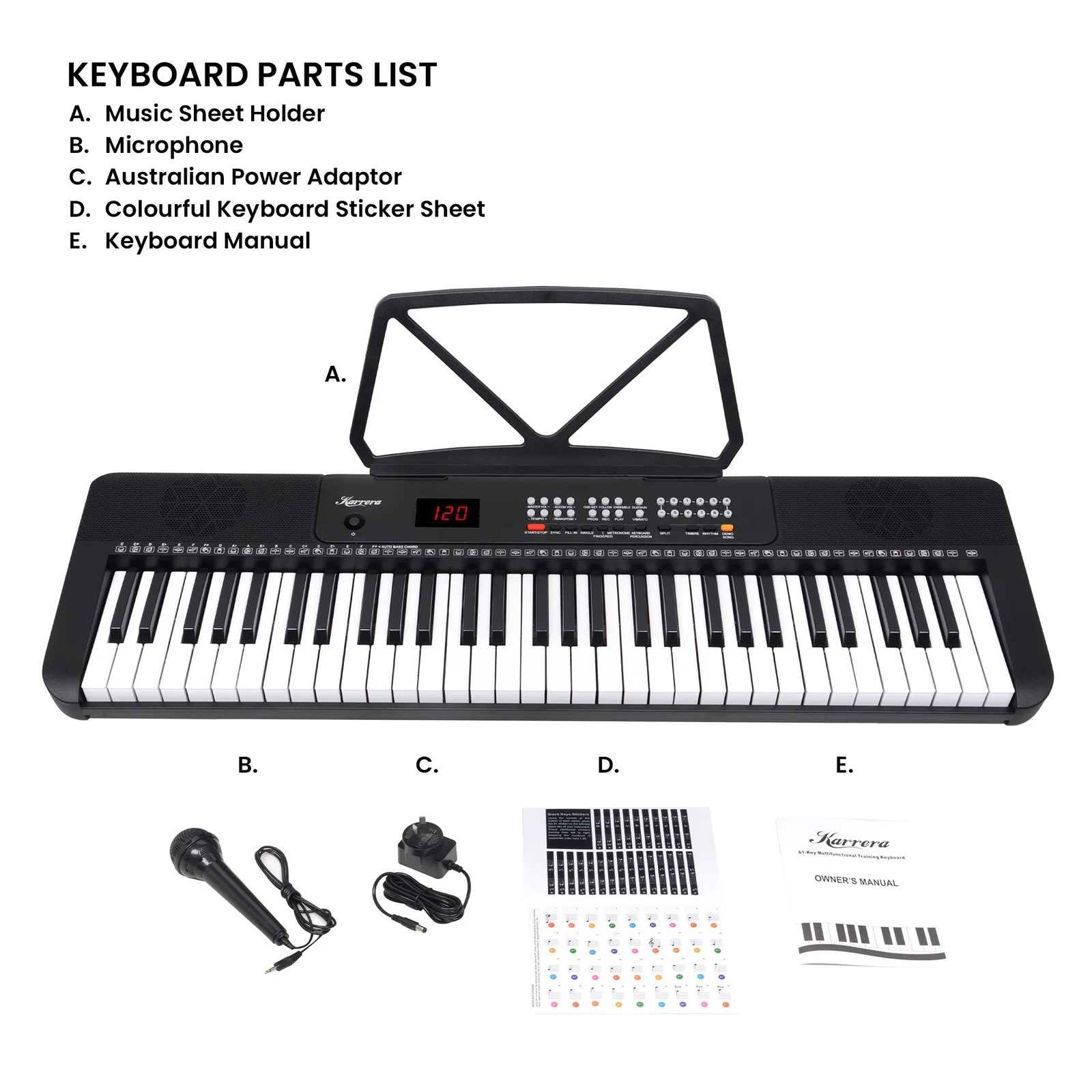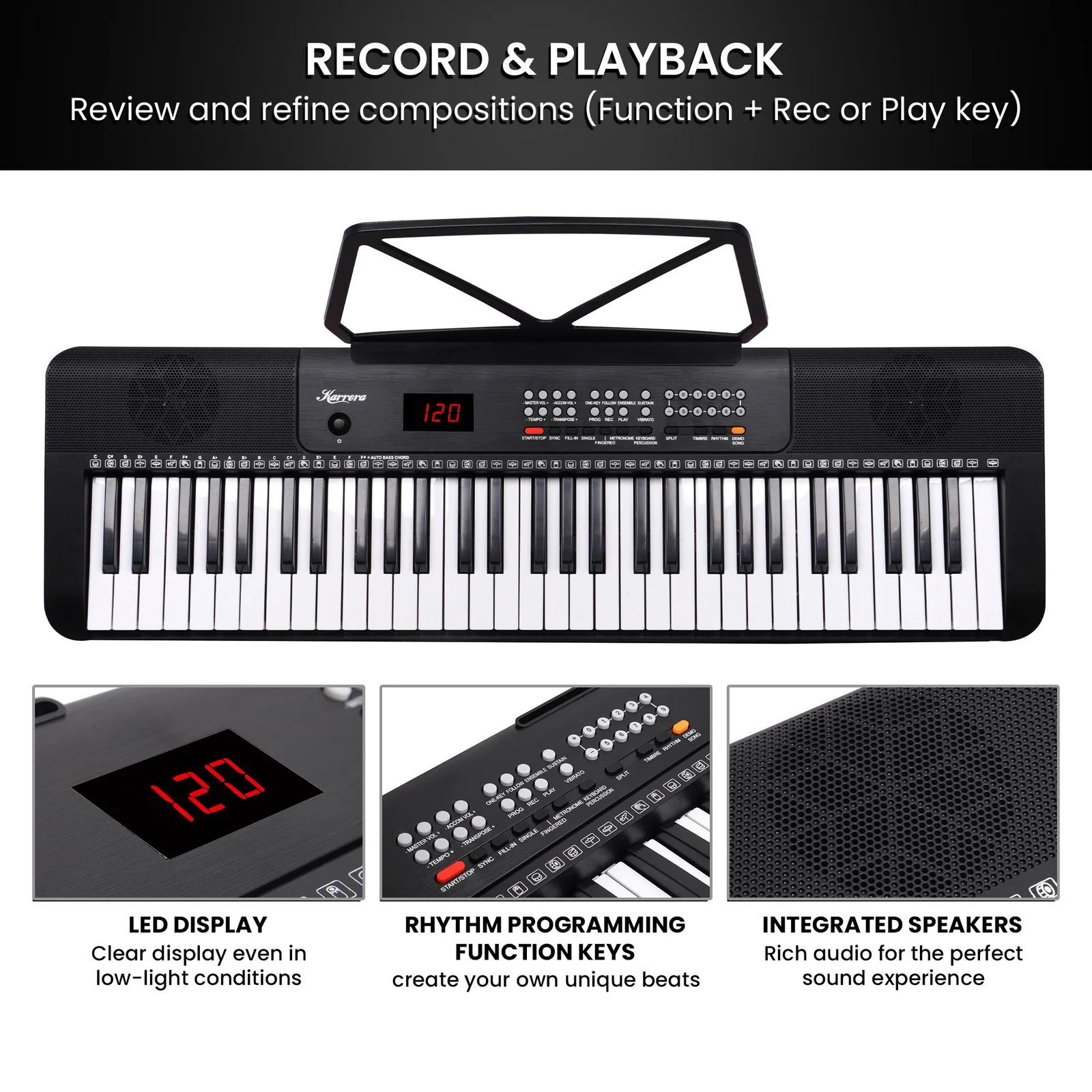 Breathe life into your compositions with the many functions of the Karrera 61-Key Keyboard! It has everything you need to let your creativity shine, whether youre just starting or a pro. With 255 timbres, 255 rhythms and various programming functions, youll have many options to explore different sounds and styles.