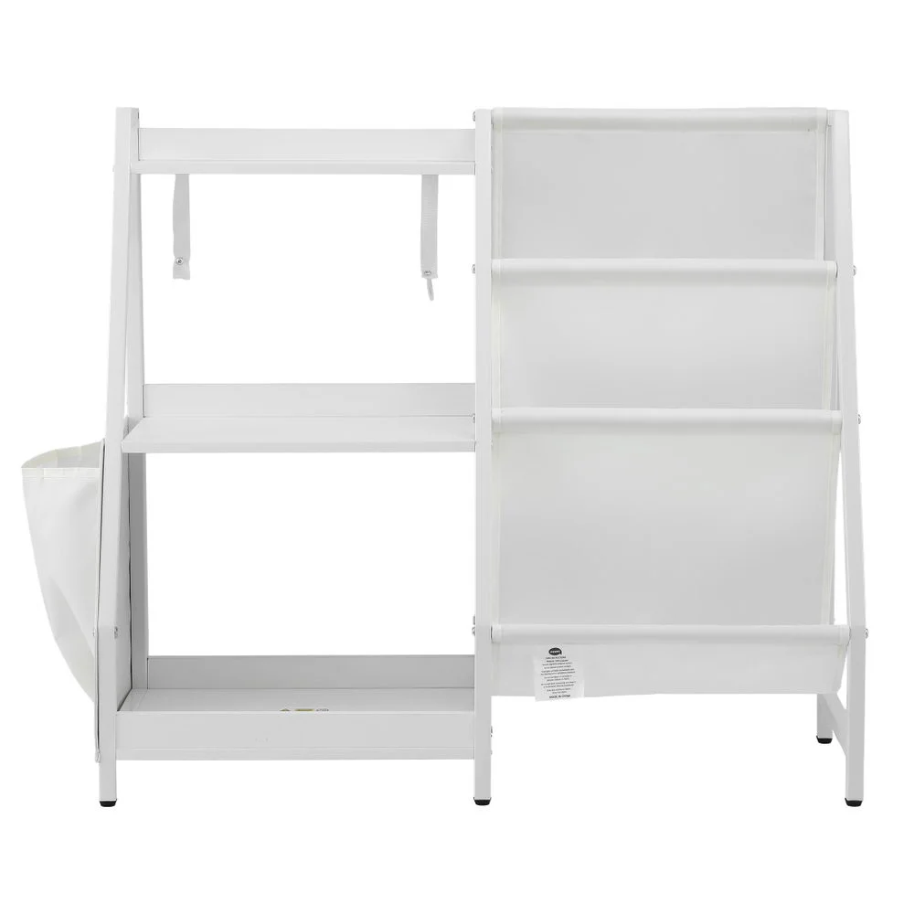 Crafted from water-resistant PB melamine with a sturdy metal frame, this white bookshelf wipes clean easily and withstands daily use. The added fabric pocket offers extra storage for small items. Measuring 75H �� 30W �� 83D cm and suitable for ages 3+, it helps develop tidying habits while fitting perfectly in bedrooms or playrooms. Simple assembly required with all hardware included.
