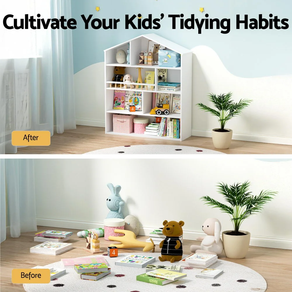 The Keezi 4-Tier Kids Bookshelf combines playful design with practical storage, featuring a charming house-shaped silhouette that adds character to any child's room. Its 4-tier open shelves with three vertical compartments provide ample space for organising books, toys, and display items while keeping everything within easy reach for little ones.