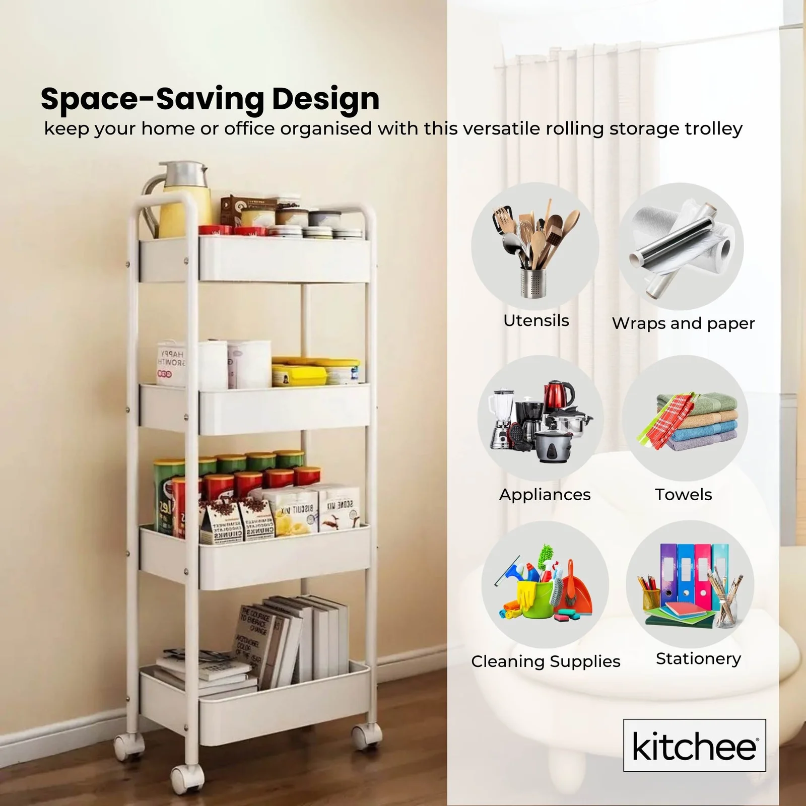 Kitchee 4-Tier Kitchen Storage Cart with Lockable Wheels will keep your home or office organised with this versatile rolling storage trolley. Featuring durable metal mesh moulded shelves, smooth-rolling caster wheels, and a lightweight steel frame, it’s ideal for use in the kitchen, bathroom, bedroom, office, or anywhere you need extra storage.