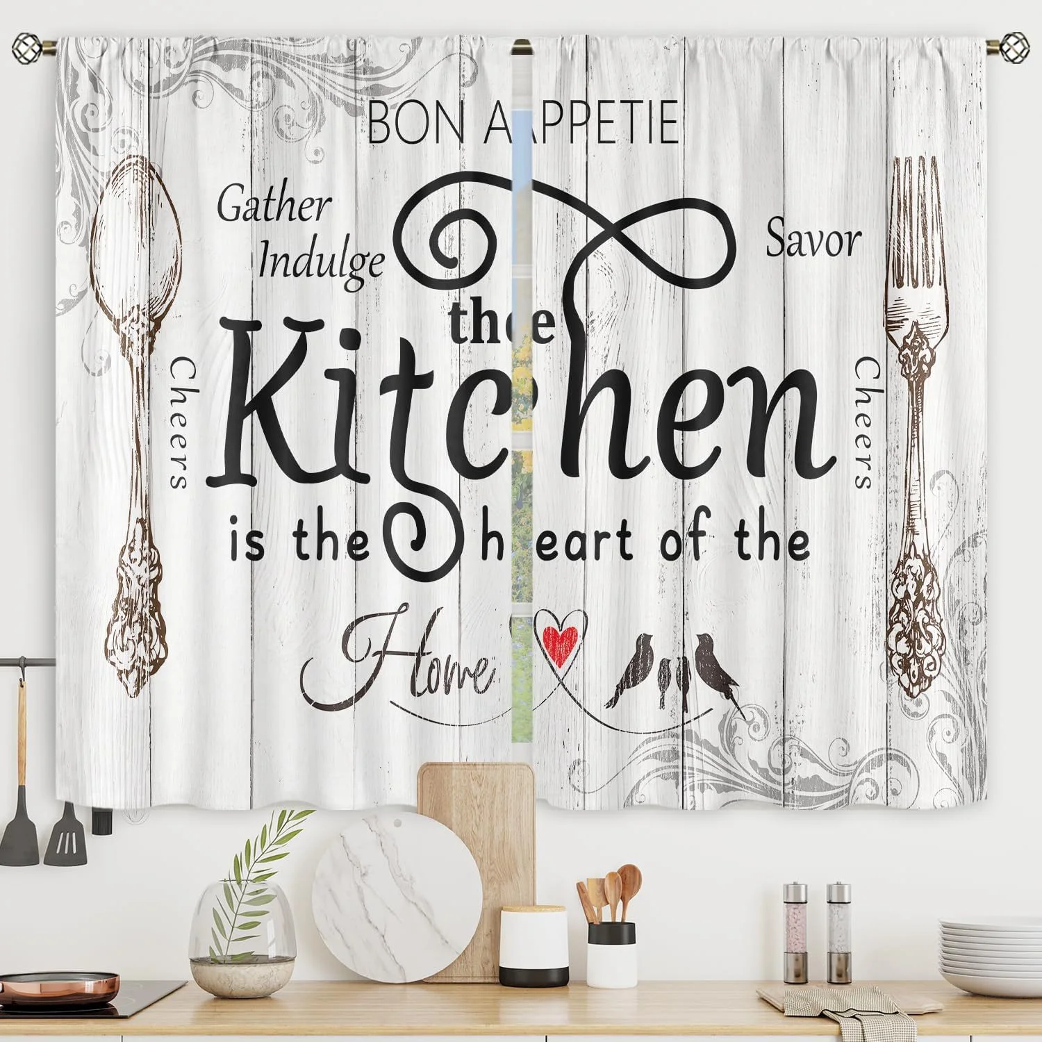 Add warmth, style, and functionality to your kitchen with this charming 3-piece kitchen curtain set—featuring a delightful Gather, Savor, Indulge design that celebrates the heart of your home! Perfect for brightening up windows above sinks, countertops, or dining nooks, this set includes 2 panel curtains and 1 valance (or 3 coordinating panels, based on standard kitchen curtain configurations), creating a cohesive, inviting look that complements any kitchen decor.Crafted from high-quality, lightweight fabric (such as breathable cotton blend or durable polyester), the curtains offer the ideal balance of privacy and natural light: they filter harsh sunlight to soften the room’s ambiance while preventing prying eyes, without blocking out essential brightness for cooking or meal prep. The fabric is also wrinkle-resistant, fade-resistant, and easy to care for—machine washable for quick cleaning, retaining its vibrant color and shape wash after wash.Adorned with charming culinary-themed text and motifs (including Gather, Savor, Indulge, Bon Appétit, and Cheers phrases, as seen in the design), paired with subtle decorative details, the curtains infuse your kitchen with a cozy, welcoming vibe—perfect for family meals, casual gatherings, or everyday cooking. The classic color palette (enhanced by accent colors like red) adds a pop of warmth, blending seamlessly with modern, rustic, farmhouse, or traditional kitchen styles.Designed for easy installation, the curtains feature rod pockets (or tab tops) that fit most standard curtain rods, allowing for quick and hassle-free hanging. The 3-piece set provides full coverage for most kitchen windows, with the valance adding a polished finishing touch to frame the window top. Whether you’re looking to update your kitchen’s decor, add privacy, or soften light, these themed curtains combine style, practicality, and personality.A wonderful addition to any home cook’s space or anyone who loves to gather with loved ones in the kitchen, this 3-piece curtain set transforms your window into a focal point that reflects the joy of sharing food and moments. Easy to mix and match with other kitchen textiles (like aprons, tablecloths, or dish towels), it’s a simple yet impactful way to elevate your kitchen’s aesthetic!