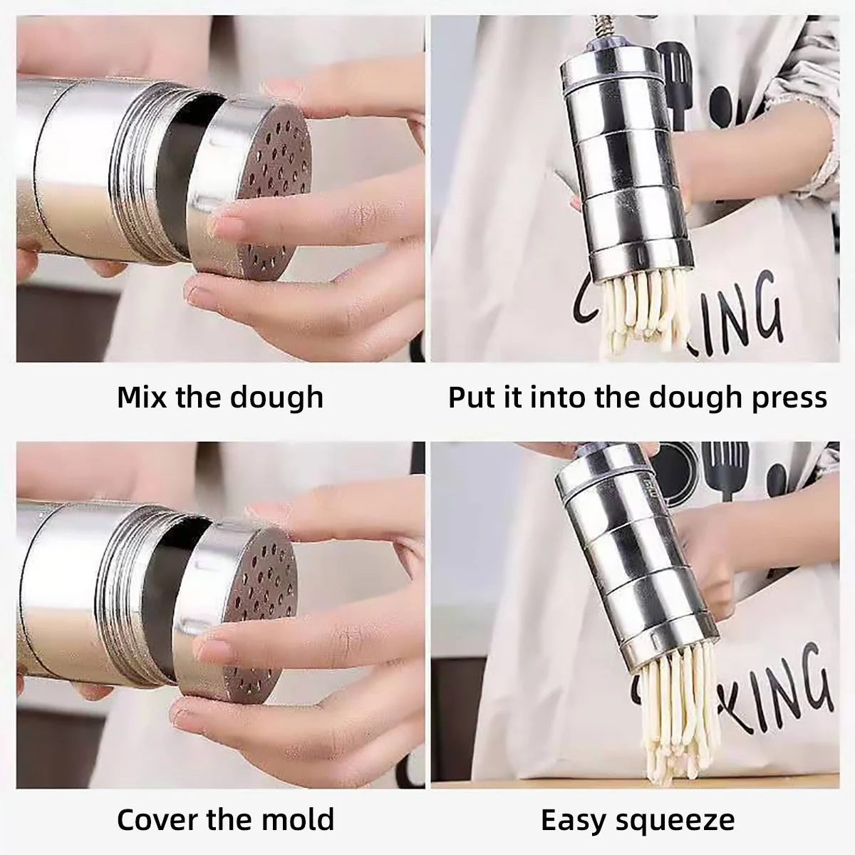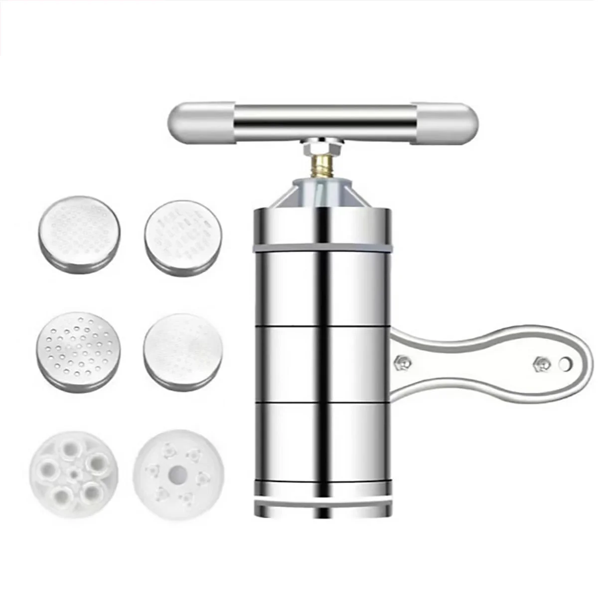 This household manual noodle press lets you craft homemade noodles with ease.Made with a sturdy stainless steel body and cast iron screw shaft, it’s durable and ideal for small kitchens.Featuring 6 interchangeable molds, it allows you to make various noodle shapes like spaghetti and vermicelli.Its compact, detachable design simplifies use and cleaning for everyday cooking.