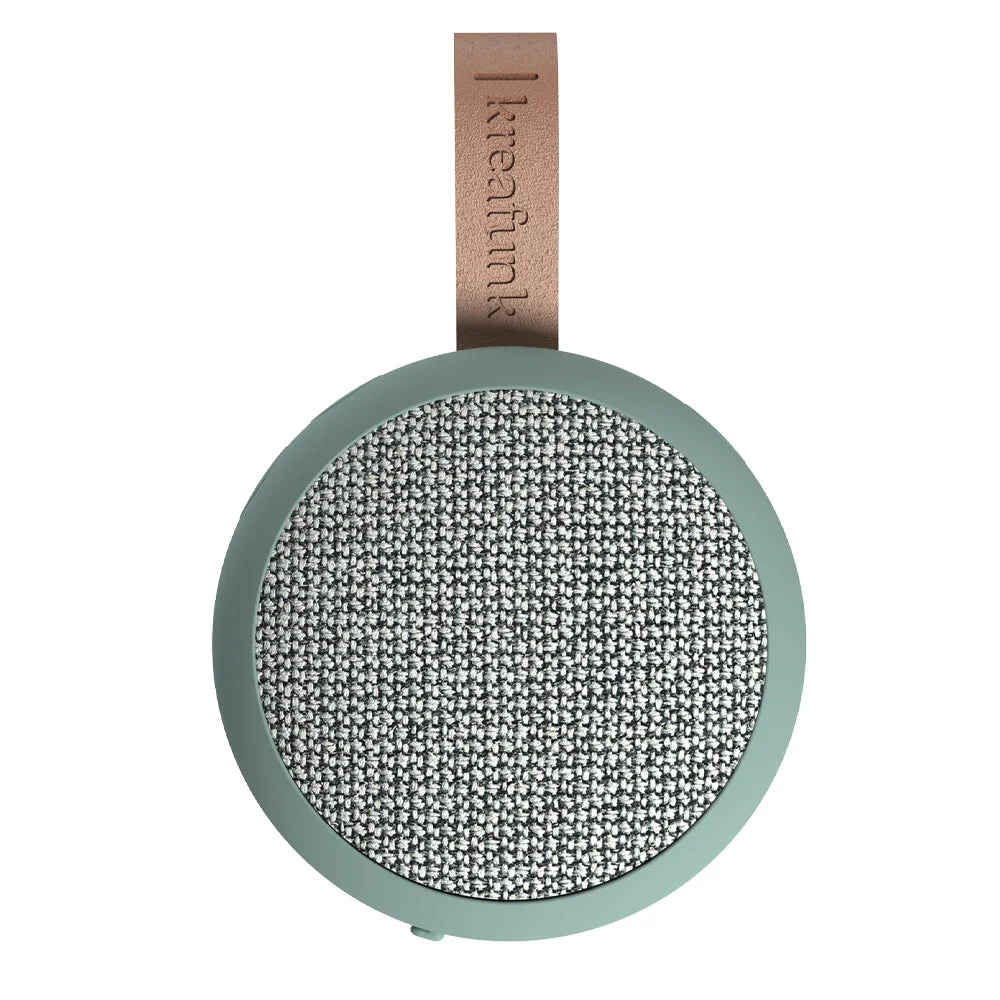 Kreafunk Ago 2 Fabric Bluetooth Speaker - Dusty Green - Kreafunk Ago 2 Fabric Bluetooth Speaker - Dusty Green - aGO 2 fabric Compact Power, Refined Sound. Don't let its size fool you the aGO 2 fabric speaker delivers big performance in a small, stylish package. An evolution of our bestselling aGO, this upgraded version features enhanced, precision-tuned sound that's surprisingly powerful for its compact form.With smooth curves and a minimalist design, the aGO 2 fabric looks right at home in any space. Hang it on a hook, slip it into your bag or pocket, and bring your music wherever life takes you. Splash-resistant and durable, it's ideal for everything from beach days to bathroom playlists.Pair two speakers using Stereo Play for immersive stereo sound perfect for parties or just enhancing your everyday soundtrack.The speaker's textile front is crafted from 98% recycled plastic bottles, supplied by Gabriel, giving it a unique look with a sustainable edge.