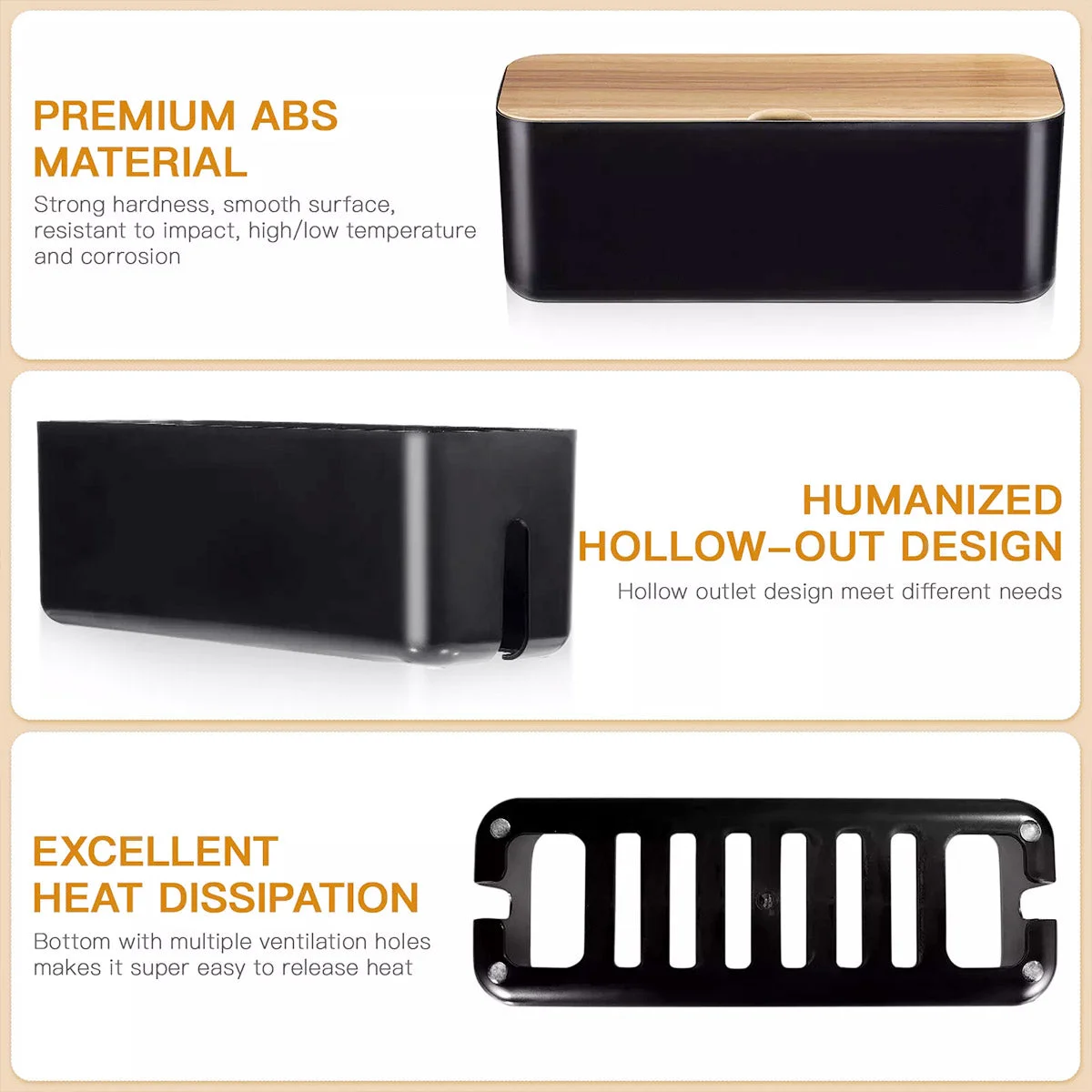 Keep your desk clutter-free and organised with this sleek cable storage box. Designed for managing power strips, wires, and cords, it provides a safe and neat solution for your workspace. Its modern design with a wood-style lid complements various home or office décors.