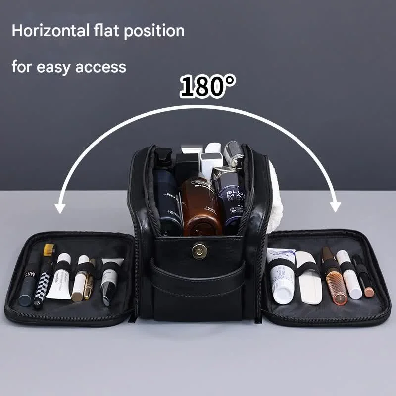 Travel in style and stay organized with this multi-functional, large-capacity toiletry bag. Made from high-quality, water-resistant PU leather with a subtle texture, this dopp kit is designed for both men and women. It features a unique three-compartment design that opens up 180 degrees for easy, flat-lay access to all your essentials. The spacious main compartment can hold large items like 400ml bottles, and includes dual internal slip pockets and a side zipper pocket. The two side wing compartments are equipped with elastic loops, mesh pockets, and a zippered section to neatly organize smaller items like toothbrushes, razors, makeup brushes, and travel-sized samples. Its big opening, dual zippers, and comfortable side handle make it the perfect travel companion for business trips or vacations.