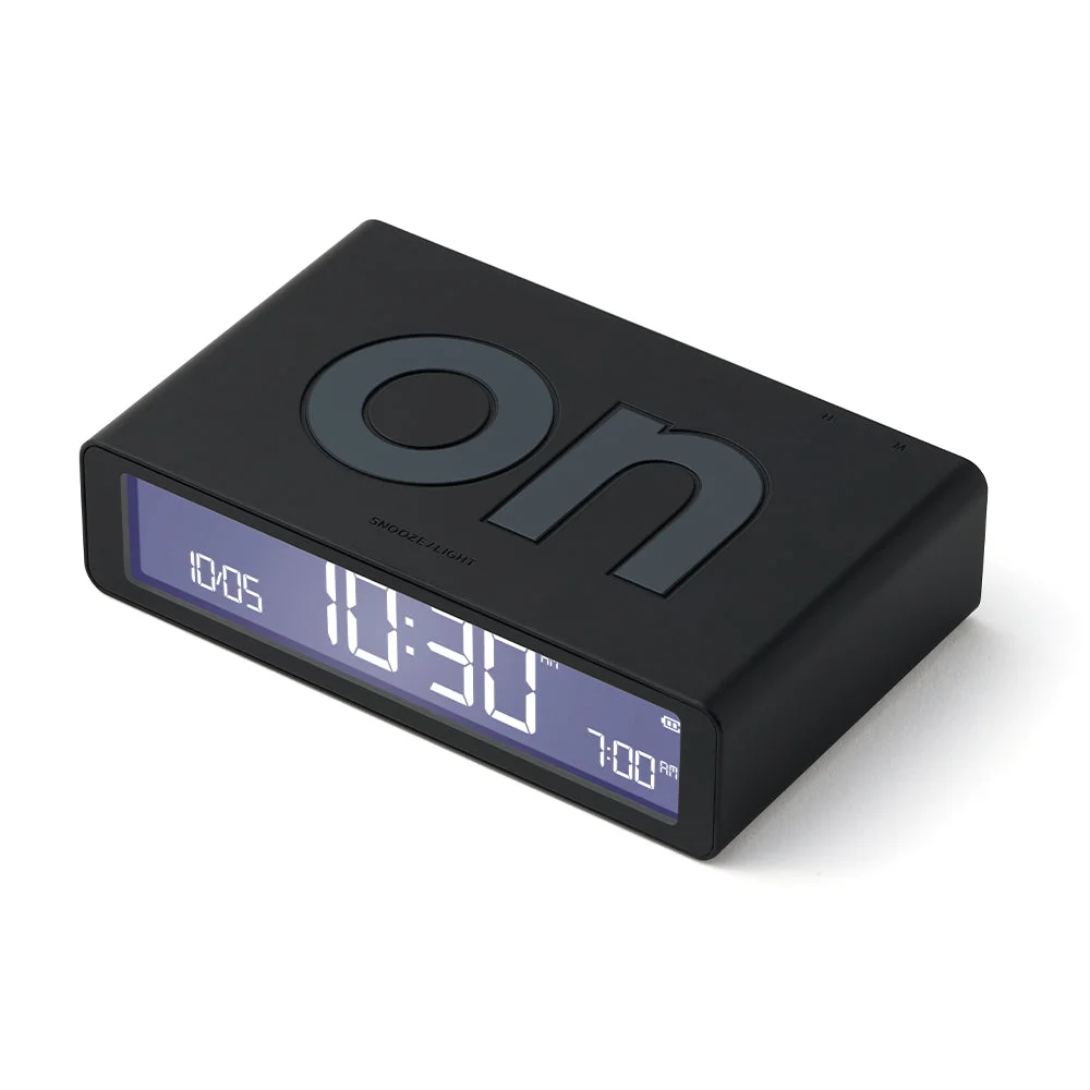 Lexon Flip Classic Reversible Alarm Clock - Black - Fun and equipped with two faces (ON / OFF), the alarm clock must be turned down to be activated or deactivated with a simple gesture. Thanks to its integrated touch control, you just have to touch it to trigger the light of its LCD display. In addition, Flip Classic features some discreet buttons on its back to set the time/date format, alarm and screen brightness. Designed to be your ultimate bedside companion, Flip Classic boasts a 6-month battery life, rechargeable via USB-C. A battery indicator is visible on screen so you’ll easily know when to recharge your device.