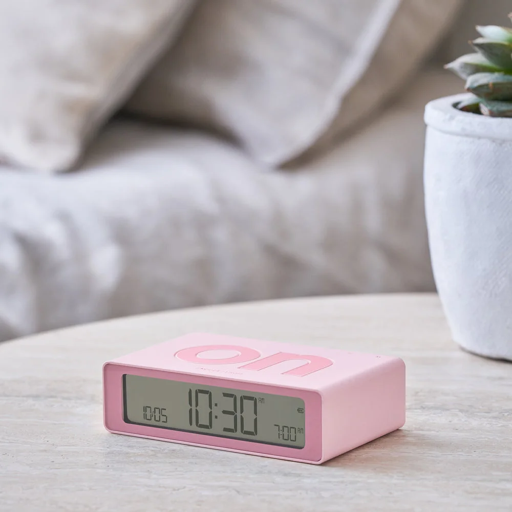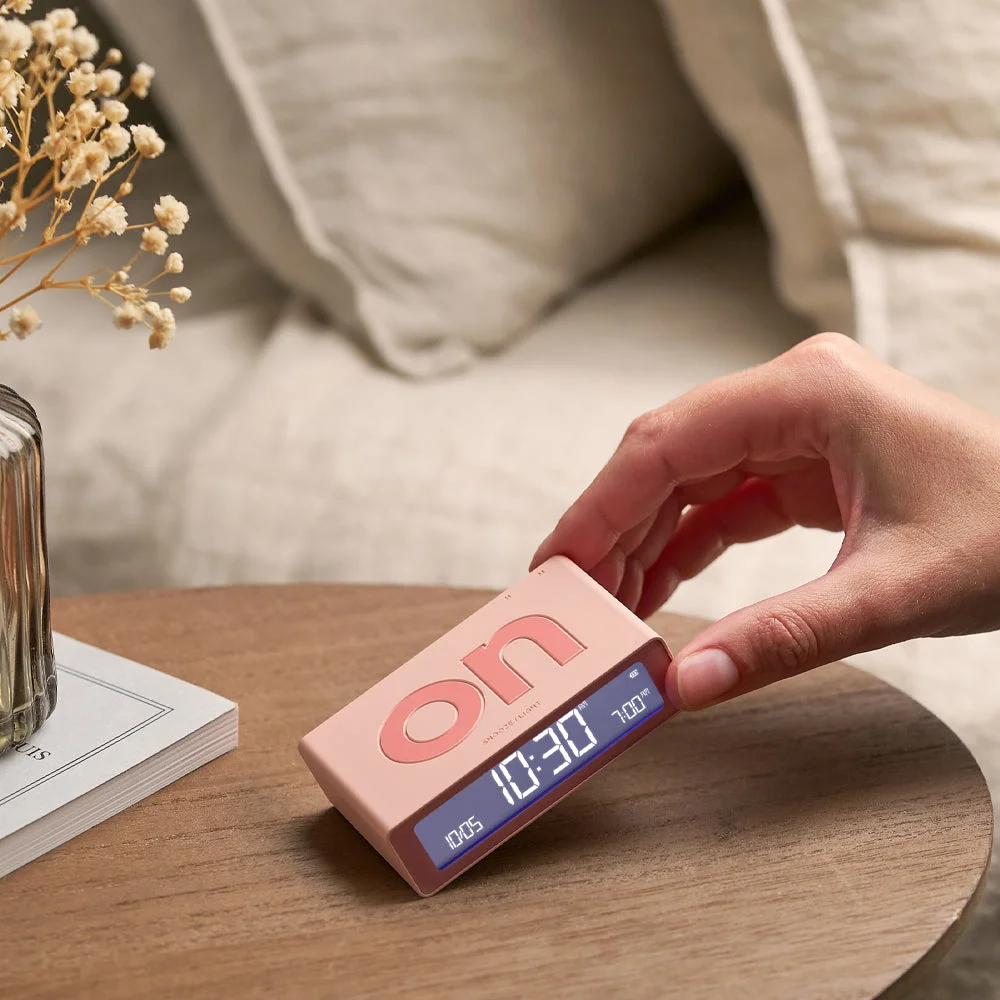 Lexon Flip Mini Reversible Alarm Clock - Pink - Our signature Flip alarm clock is also available in a smaller travel version that you can easily carry away. Fun and equipped with two faces (ON / OFF), the alarm clock must be turned down to be activated or deactivated with a simple gesture. Thanks to its integrated touch control, you just have to touch it to trigger the light of its display. Featuring a silicone rubber finishing that offers a soft touch and a compact size, Flip+ Travel allows you to upgrade your bedside discreetly. Available in several colors, Flip+ Travel is the must-have accessory to wake up with style.