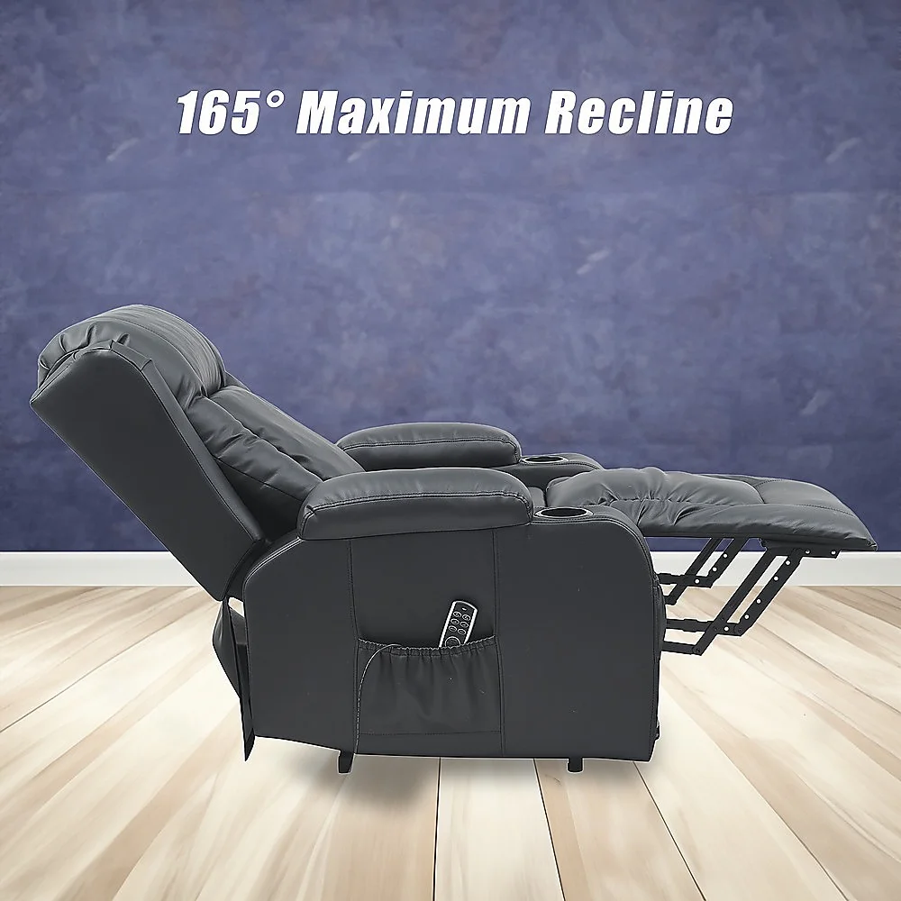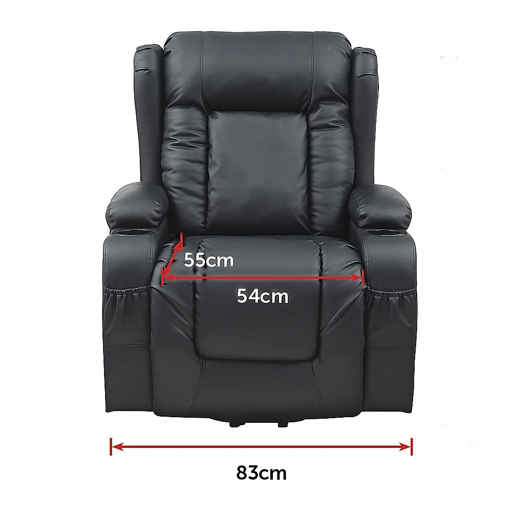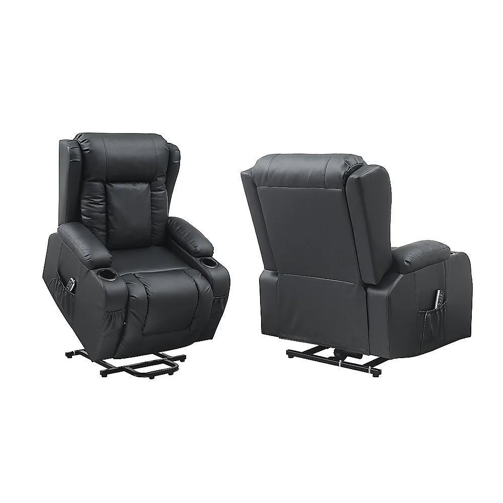 Experience unparalleled comfort upon returning home from work with our heated massage lift recliner. This Palermo recliner, expertly crafted from PU leather, seamlessly combines contemporary aesthetics with optimal functionality. Its neutral black hue effortlessly complements any colour scheme, making it a stylish addition to your living room or rumpus room.