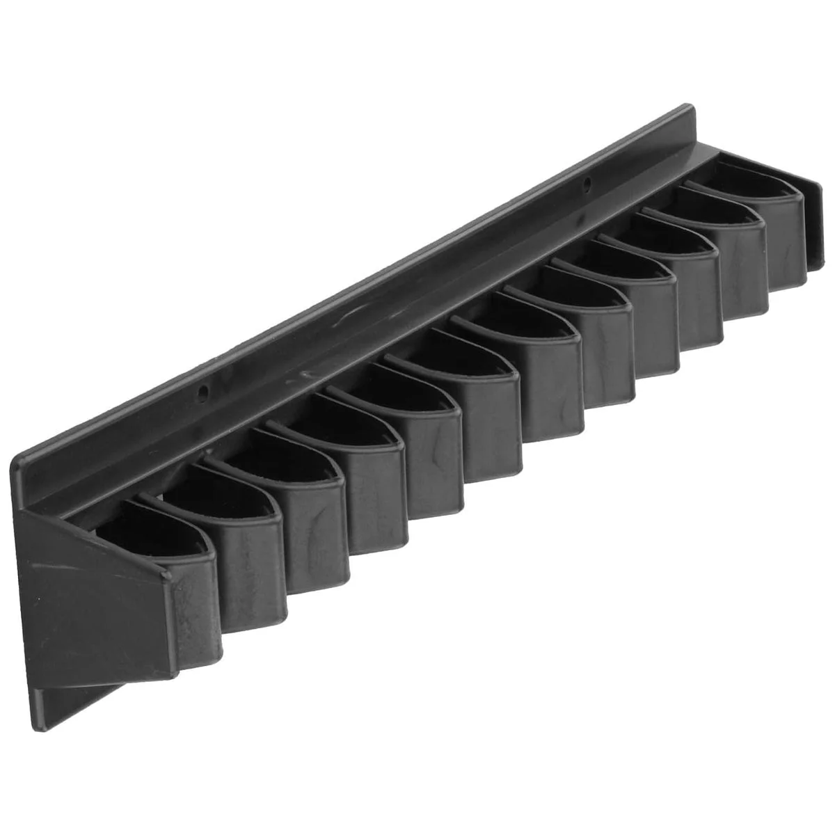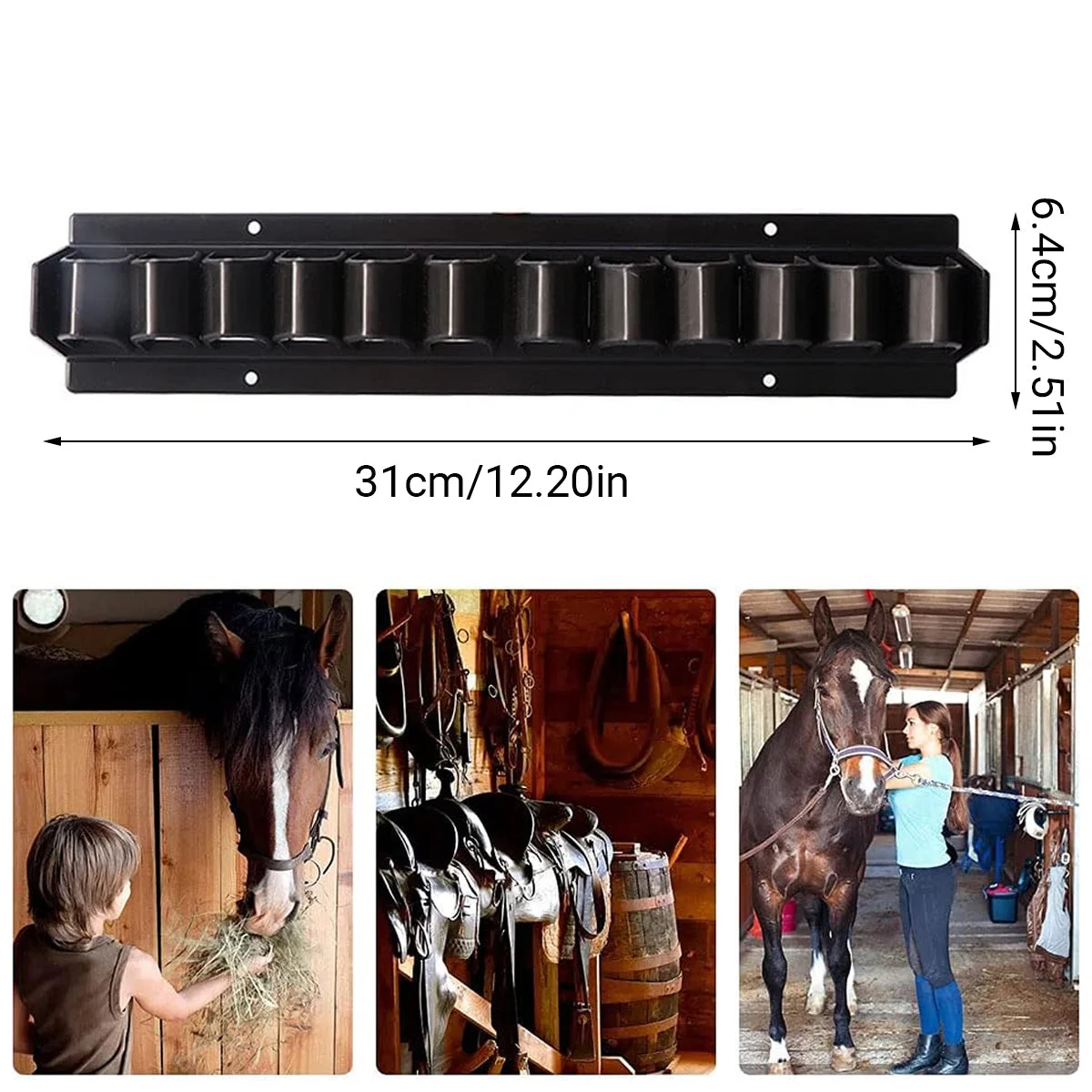 This plastic storage rack keeps equestrian gear neat and accessible for stables or barns.It holds up to 11 riding whips, crops, or grooming tools, with a wall-mount design that saves floor space.Made of durable plastic with smooth edges, it enables quick access during grooming/training, keeping tack areas organized for daily barn use.