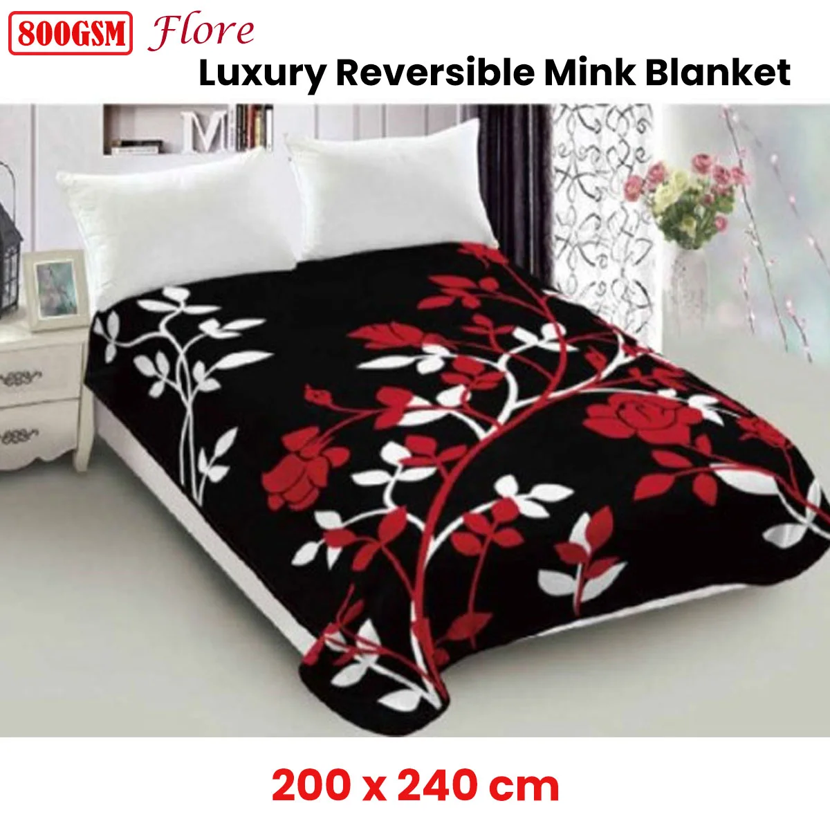 Transform your bedroom into a luxurious haven with the 800GSM Luxury Reversible Mink Blanket Flore Queen 200 x 240 cm. This mink blanket features a soft texture and a 800GSM weight, perfect for year-round comfort and warmth. It showcases a stunning floral design in a vibrant color palette of red, white, and black, adding a touch of elegance and cheer to your decor. This versatile blanket is machine washable for easy care and is sure to become a favorite for movie marathons, cozy nights in, or simply adding a touch of floral flair to your bed.