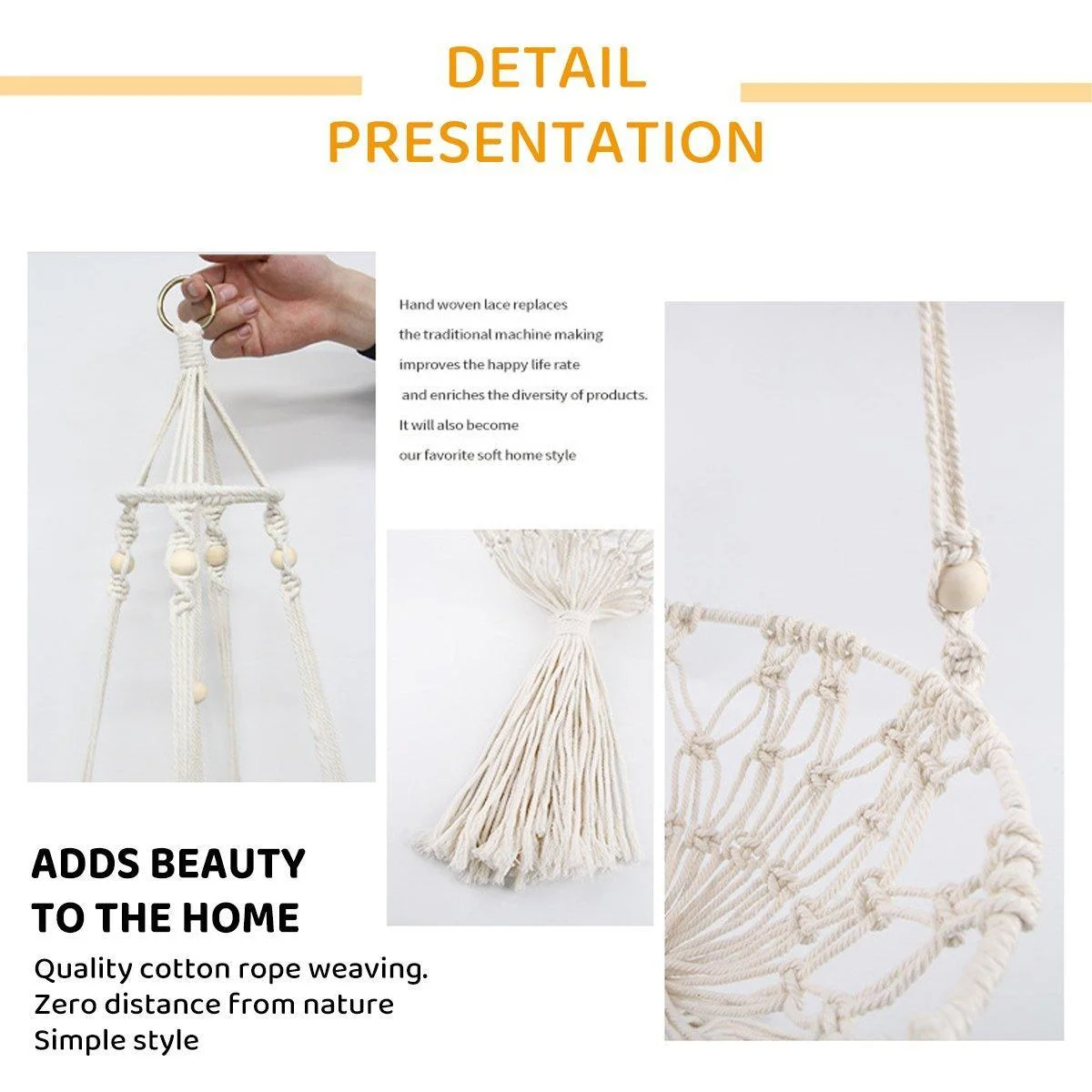 Material: Cotton Rope, Wooden Beads, Soft Cushion