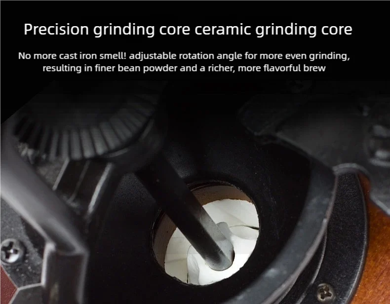 At the heart of this grinder lies a high-quality ceramic grinding core. Unlike cast iron, ceramic burrs prevent any metallic odors from affecting the delicate flavor of your coffee. The rotational angle allows for precise control over the grind consistency, ensuring your coffee powder is evenly and finely ground. This meticulous process extracts the best possible flavor from your beans, delivering a superior brewing experience every time.