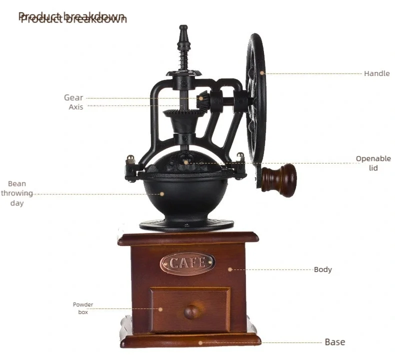 Constructed with a robust cast iron mechanism and a wooden base, this grinder measures approximately 11.5 cm by 27 cm. The thoughtful design allows for easy disassembly, as shown in the product breakdown, making cleaning and maintenance straightforward. The powder drawer can hold approximately 35g of ground coffee, ideal for single servings or small batches.