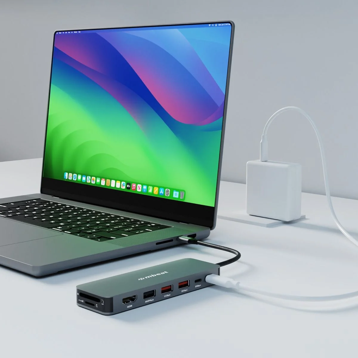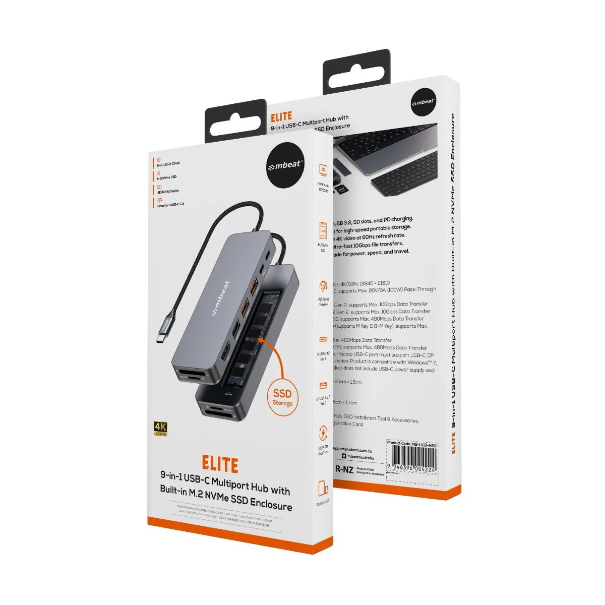The mbeat Elite 9-in-1 USB-C Multiport Hub is a compact, high-performance solution designed for professionals, creatives, and business users on the go. Featuring a built-in M.2 NVMe SSD enclosure, this hub allows users to expand storage and access files at high speed, making it perfect for large file transfers and backups. It also includes 3 x 10Gbps USB 3.2 Gen 2 ports (2 x USB-A, 1 x USB-C), 1 x USB 2.0 port, 4K HDMI output, and SD and microSD card slots for seamless data transfer and peripheral connectivity. The PD 100W pass-through charging ensures your laptop stays powered with your charger, making it the ideal accessory for reliable connectivity and mobile storage.