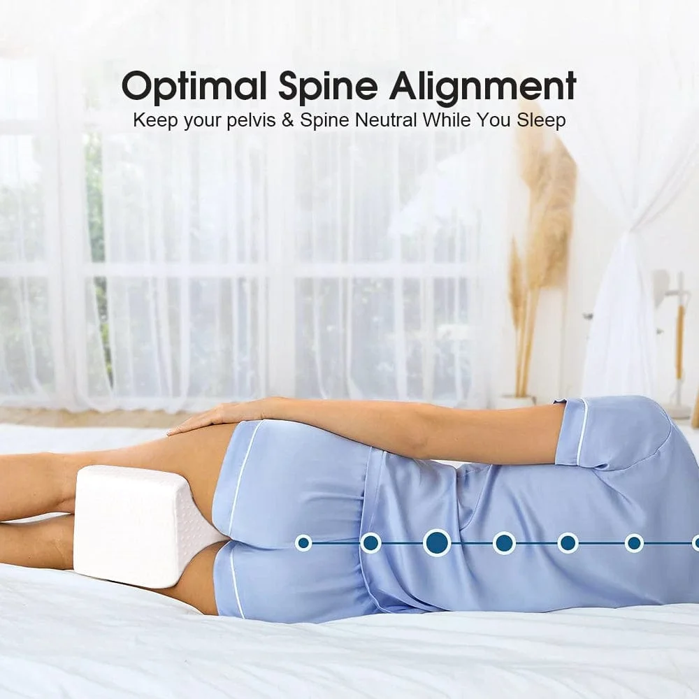 The Memory Foam Sciatica Relief Leg Pillow provides proper spinal alignment and reduces pressure while sleeping, which helps relieve pain from sciatica, scoliosis, and bursitis.