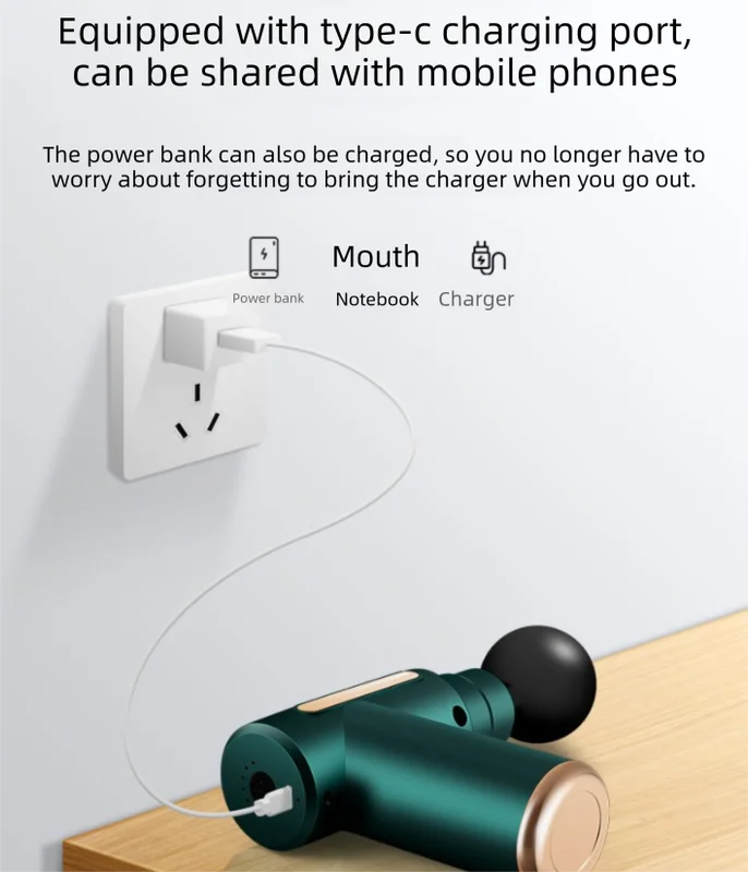 This product contains a rechargeable lithium battery. Please follow all safety instructions when charging and using the product. Do not disassemble, short circuit, expose to high temperatures, or throw the product into fire. Do not use the massage gun on bones, the head, or open wounds. Stop use immediately if you feel pain or discomfort.