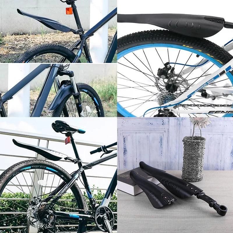 Protect your ride from splashes and dirt with this bicycle mudguard set, designed for front and rear tyre coverage. Made from high-strength synthetic fiber plastic, these bike fenders are lightweight, rust-resistant, and built for durability on rugged trails. The mountain bike mudguard fits most MTB and road bikes with seat post diameters under 34mm. Installation is tool-free, and the rear mudguard height can be adjusted to suit your frame. With a streamlined design and flexible build, this cycling mudguard set offers reliable protection in rain, mud, and harsh riding conditions.