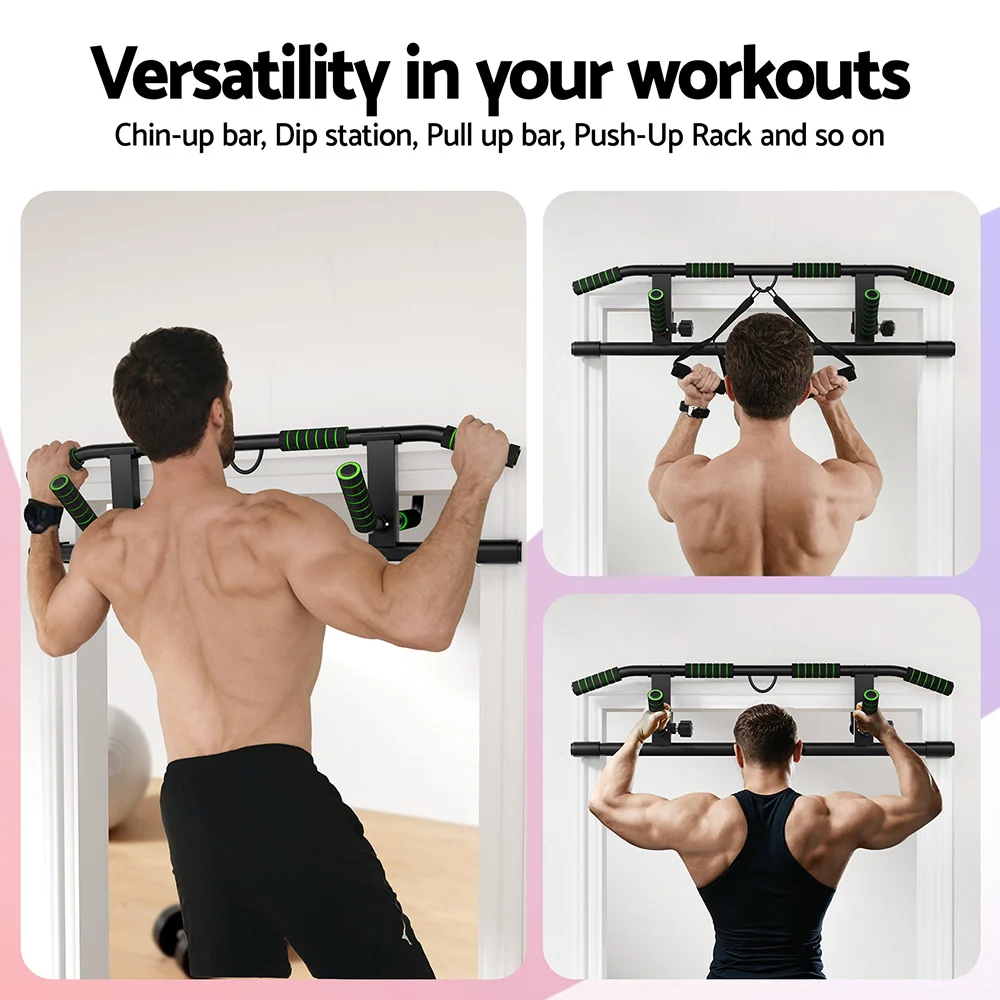 The Everfit Multi-Grip Doorway Pull Up Bar offers a heavy-duty 200kg capacity for full-body home workouts. Its multi-grip design supports chin-ups, pull-ups, and push-ups, while the anti-slip system ensures safety during intense sessions. Includes 2 resistance bands for added versatility and adjustable intensity. Built with robust carbon steel and ergonomic foam grips, this space-saving bar fits standard door frames without drilling. Perfect for strength training, stretching, or functional fitness routines.