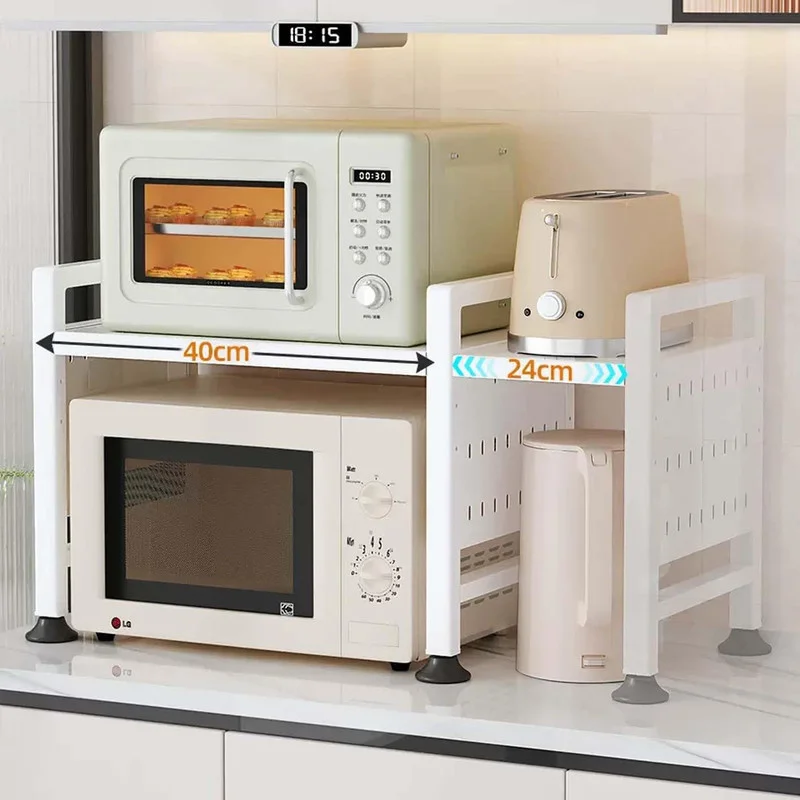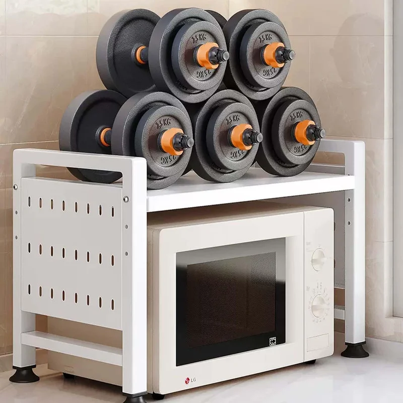 This new multifunctional microwave shelf can store much more kitchen stuff. It has two sides of hanging board. You can hang with three hooks, cutlery tray and spice rack or whatever you want to. It will save more your kitchen space and make it look much more tidy and organized. It is a highly recommended new shelf for your home and kitchen.
