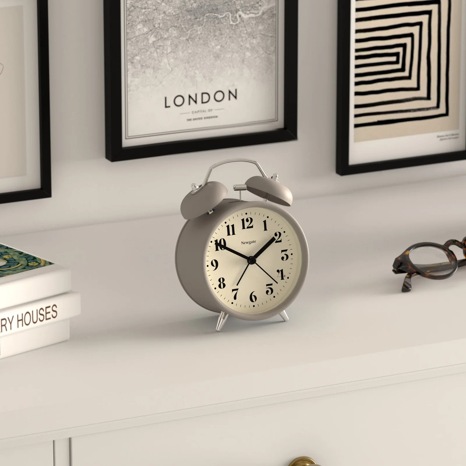 The Theatre Alarm Clock in a Matt Stone finish, contemporary graphic dial and a moving hammer and twin-bell alarm.