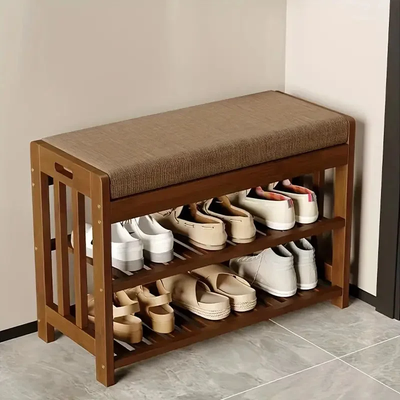 Elevate your entryway with this stylish and practical 2-tier bamboo shoe rack bench, featuring a cushioned seat and dustproof storage.