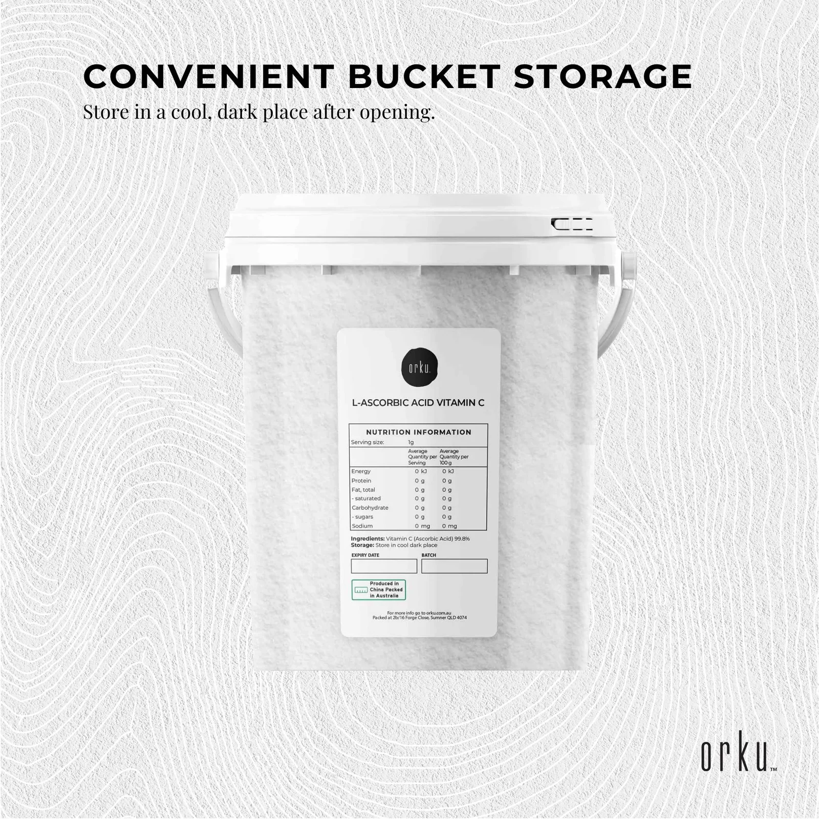 Pure Vitamin C Powder available in in resealable buckets.
