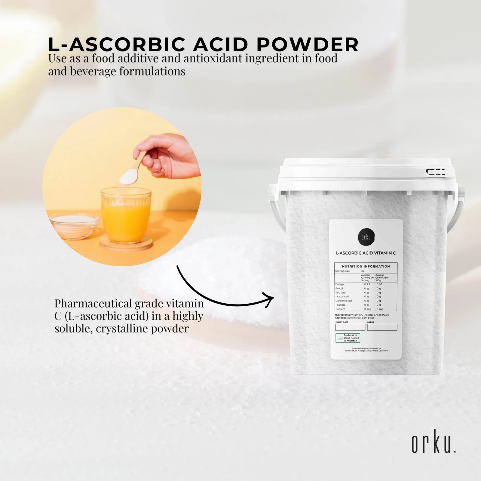 Our Ascorbic Acid Powder (L-Ascorbic) has a purity of 99.8%. More commonly known as Vitamin C Powder, it is pure Pharmaceutical and Food Grade and GMO Free. It serves as a food additive/antioxidant for vitamin C fortification in food and beverages.