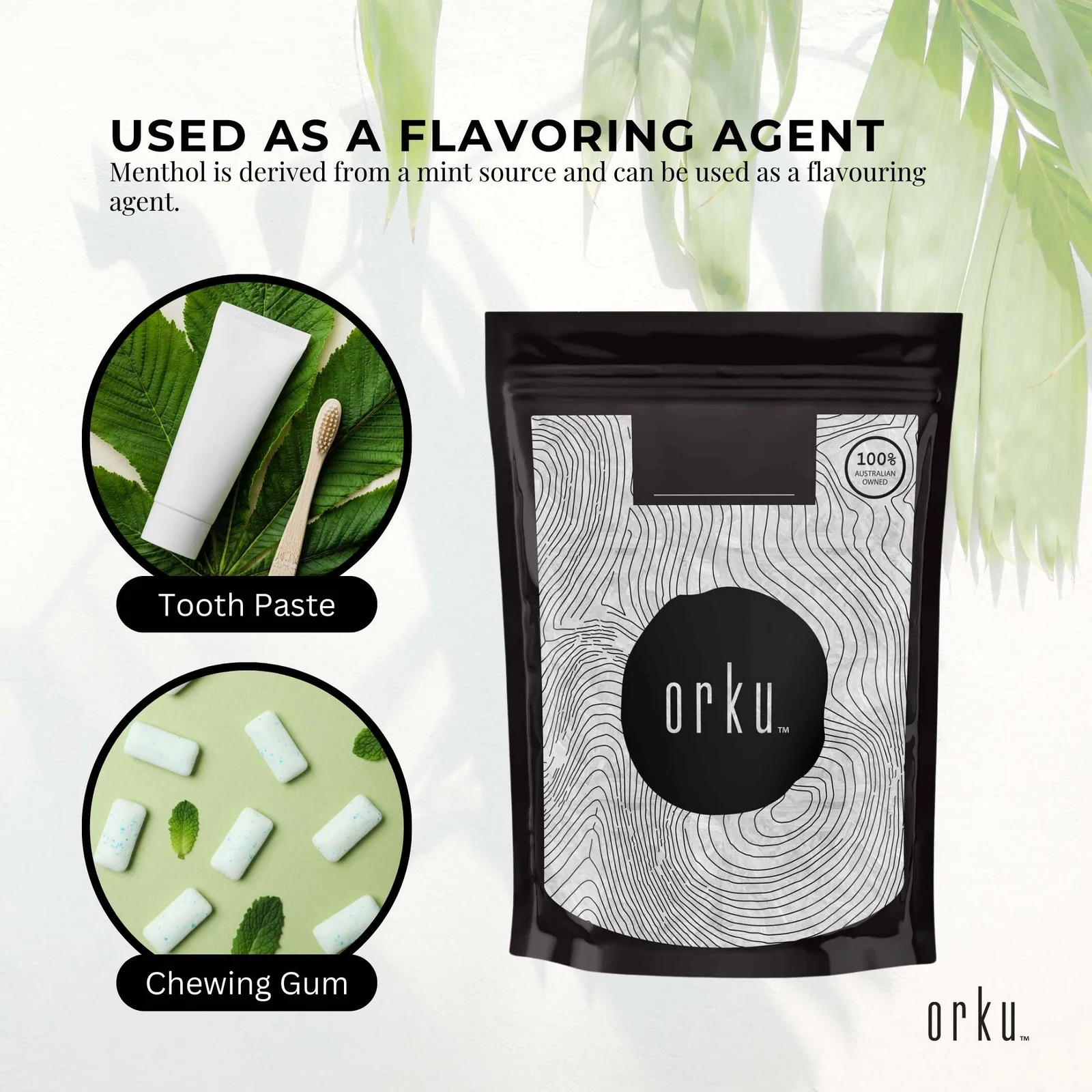 These crystals are slightly water soluble and often used to enhance cosmetic products such as lotions, creams and balms. Menthol is derived from a mint source and can be used as a flavouring agent.