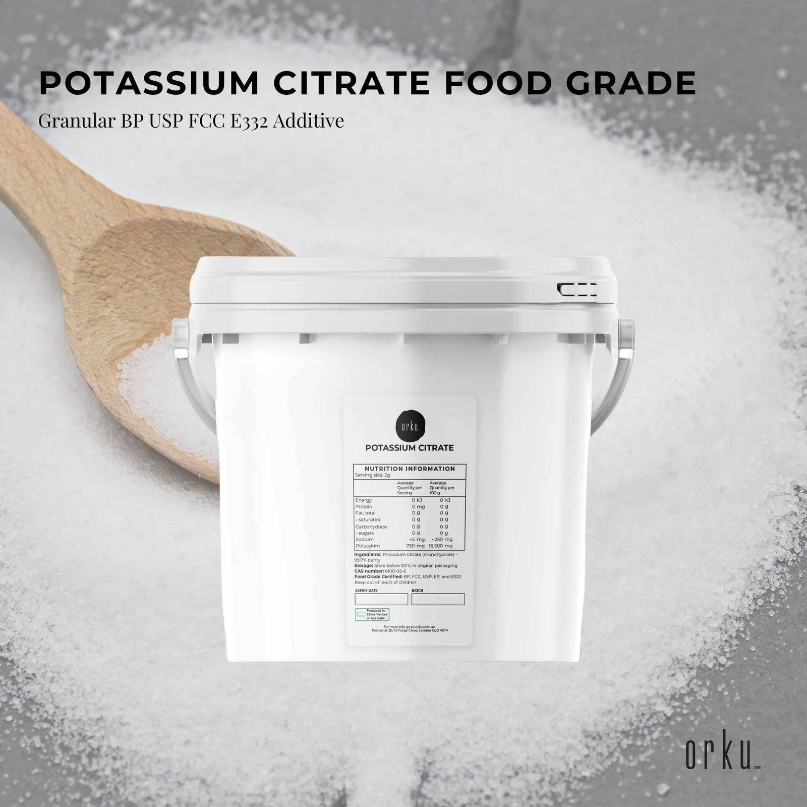 Orku High-purity Potassium Citrate BP/FCC (E332), a food-grade, white granular powder commonly used as a buffering agent, emulsifier, or acidity regulator in food and beverage production. Also suitable for use in cosmetics, laboratory, and industrial formulations. This product complies with international standards including BP, USP, EP, FCC, and E332, ensuring exceptional quality and consistency.