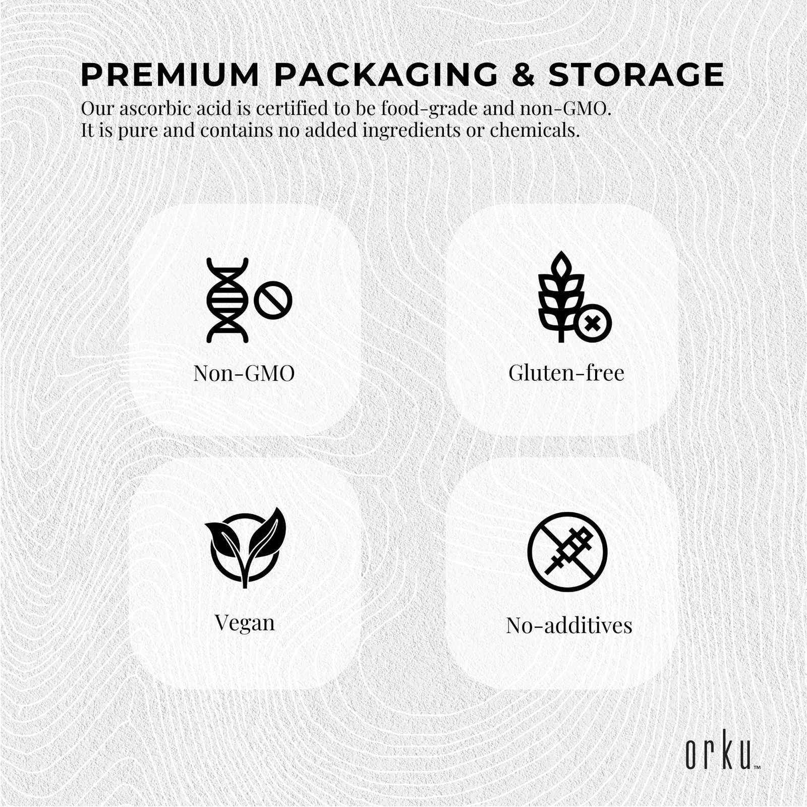 Our Ascorbic Acid Powder (L-Ascorbic) has a purity of 99.8%. More commonly known as Vitamin C Powder, it is pure Pharmaceutical and Food Grade and GMO Free. It serves as a food additive/antioxidant for vitamin C fortification in food and beverages.