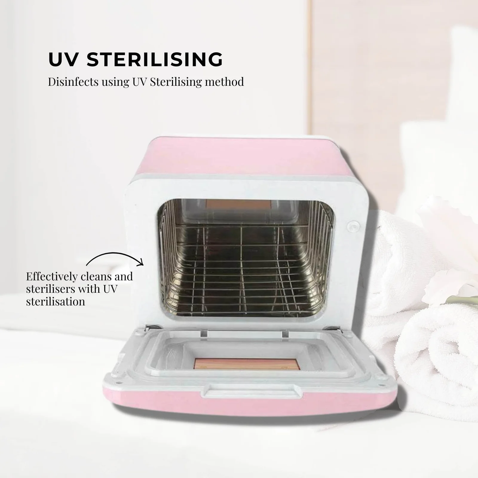 Effectively cleans and sterilisers with UV sterilisation, leaving towels and other articles of clothing clean and disinfected, storing approximately 4-6 small towels.