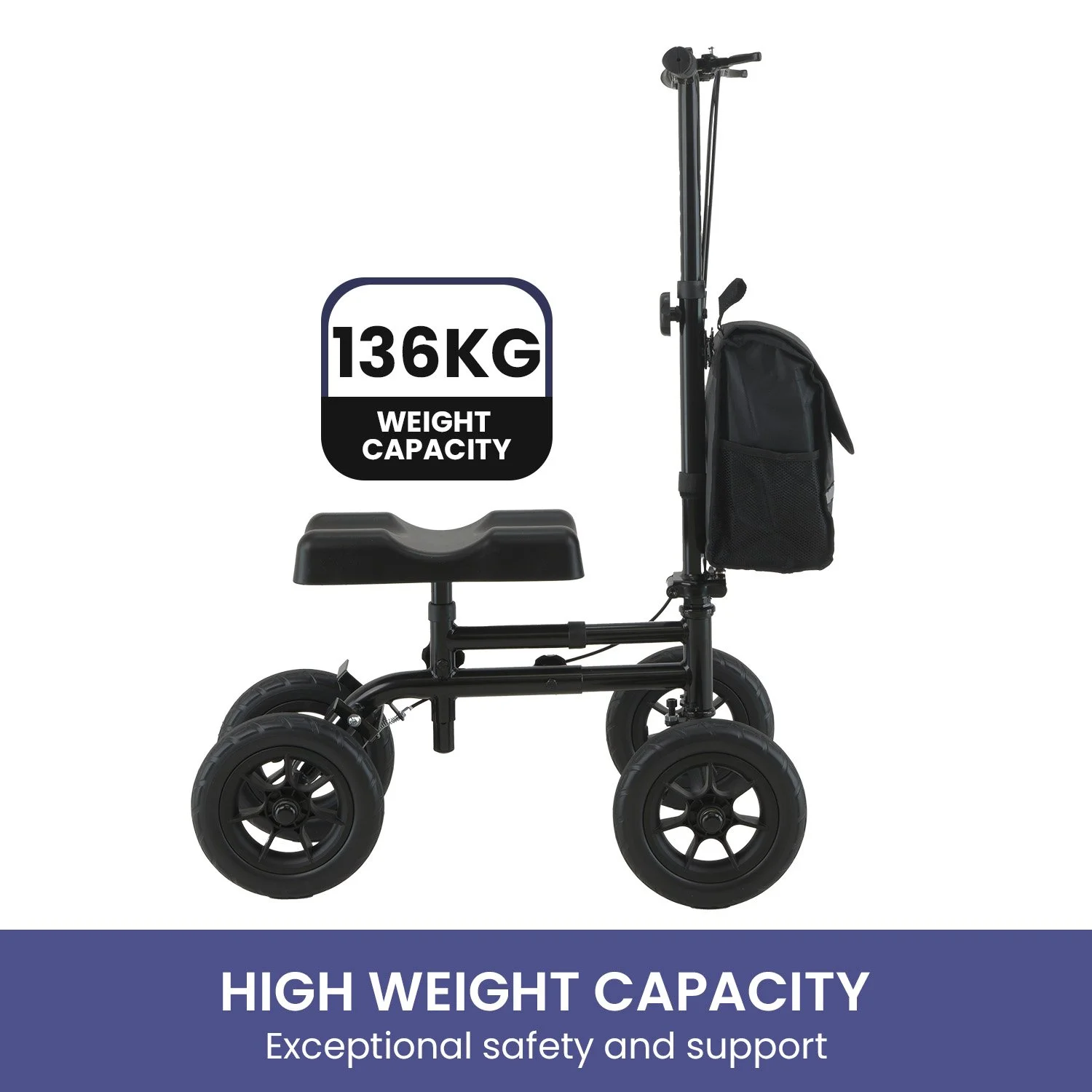 This knee walker features a height-adjustable knee pad and handles for your comfort. Supporting up to 136kg, the Orthonica knee scooter provides reliable performance even on rough surfaces. It also includes a handy cloth bag for keeping essentials within reach, making it perfect for both indoor and outdoor use, giving you a hassle-free experience.