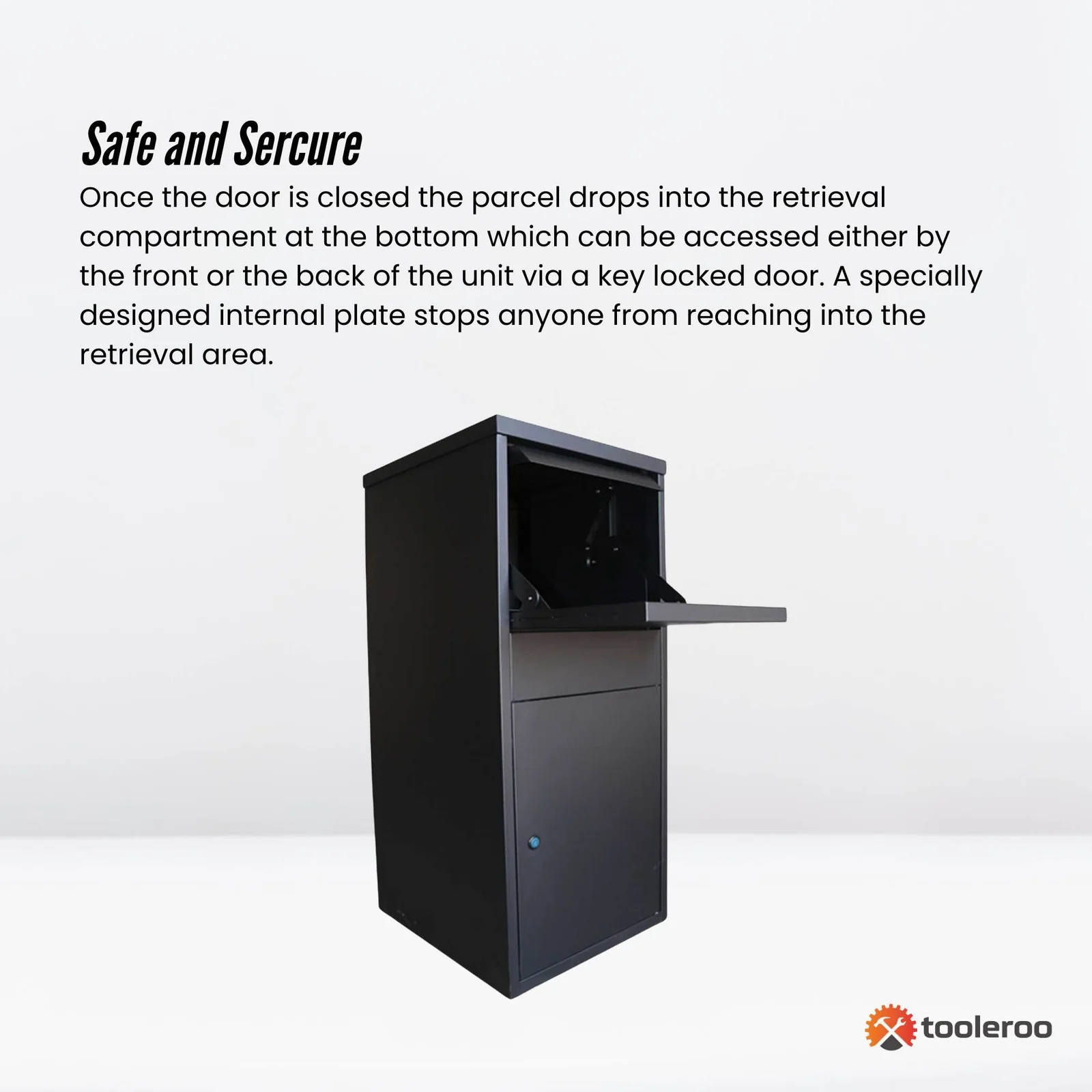Parcels up to 28 x 35 x 26cm can be delivered by simply opening the parcel delivery chute and placing the parcel inside. Once the door is closed the parcel drops into the retrieval compartment at the bottom which can be accessed either by the front or the back of the unit via a key locked door. A specially designed internal plate stops anyone from reaching into the retrieval area.