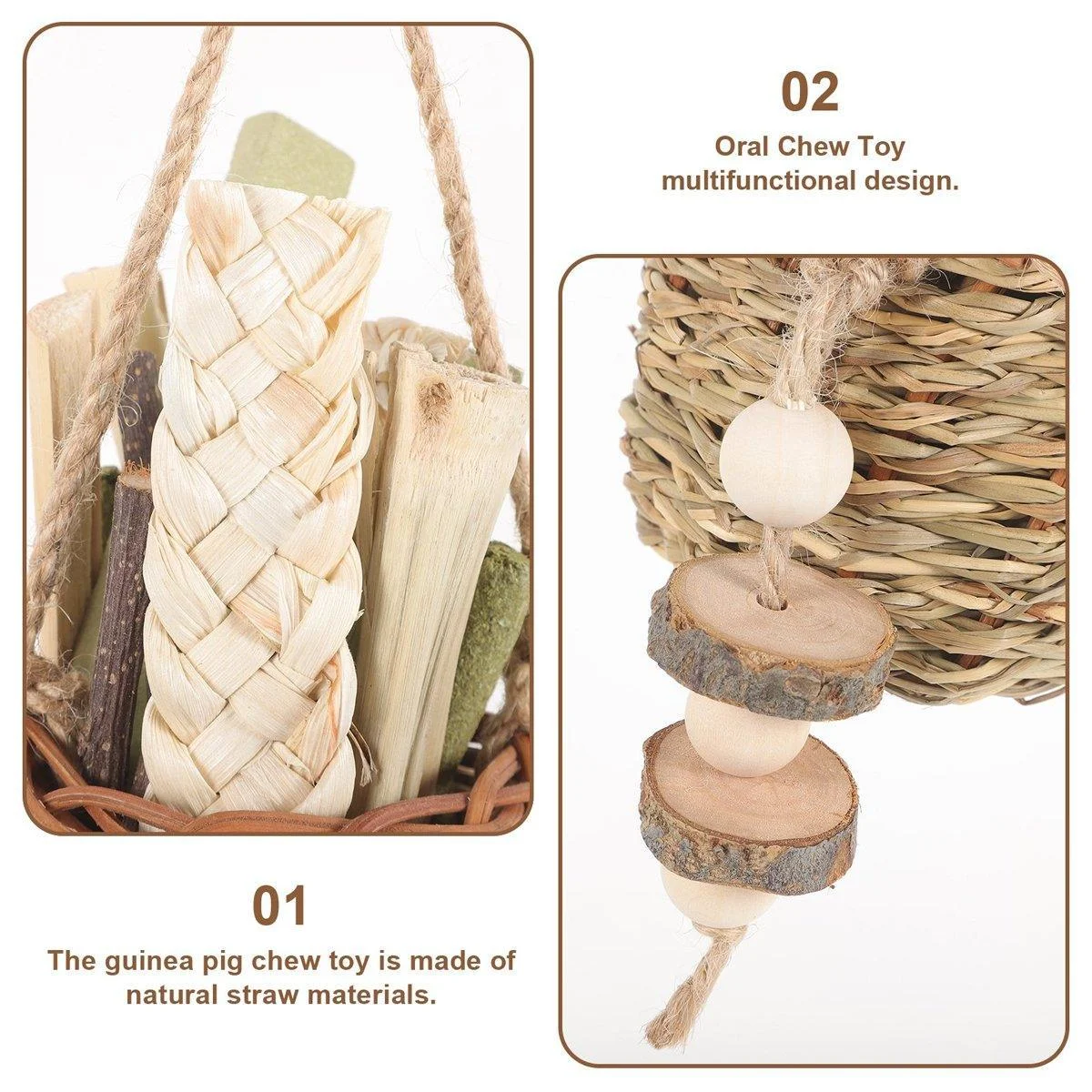 Provide your small pets with a fun and healthy chewing experience with this thoughtfully designed teething stick set. Made with natural materials, this set promotes better dental health, reduces stress, and encourages natural foraging behaviour. Perfect for hamsters, guinea pigs, rabbits, and other small pets, the set includes a variety of chewable sticks, braided toys, and a hanging woven basket for interactive play.