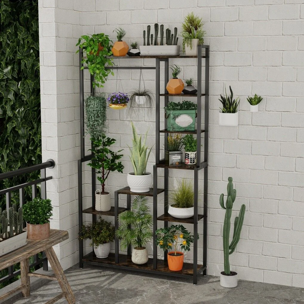 Plant Stand Shelf Rack with Hanging Rod Indoor Outdoor Display