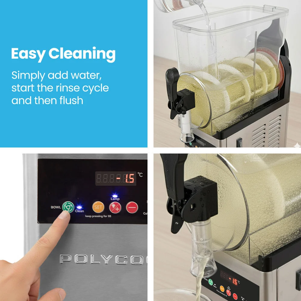 Deliver big results from a compact machine with this POLYCOOL Commercial 12L Single Tank Slushie Maker. Perfect for cafés, bakeries, food trucks, and party rental businesses, it's the ideal balance of performance and efficiency. The powerful compressor and dual-beater system deliver consistent freezing and consistently smooth texture - keeping queues moving and profits flowing.