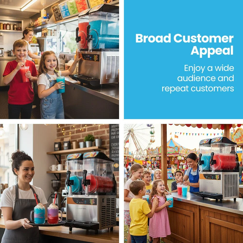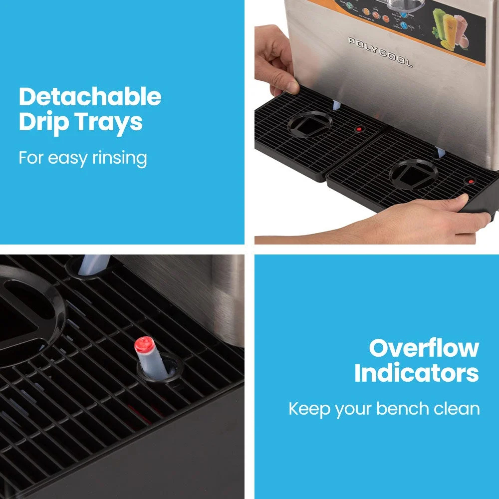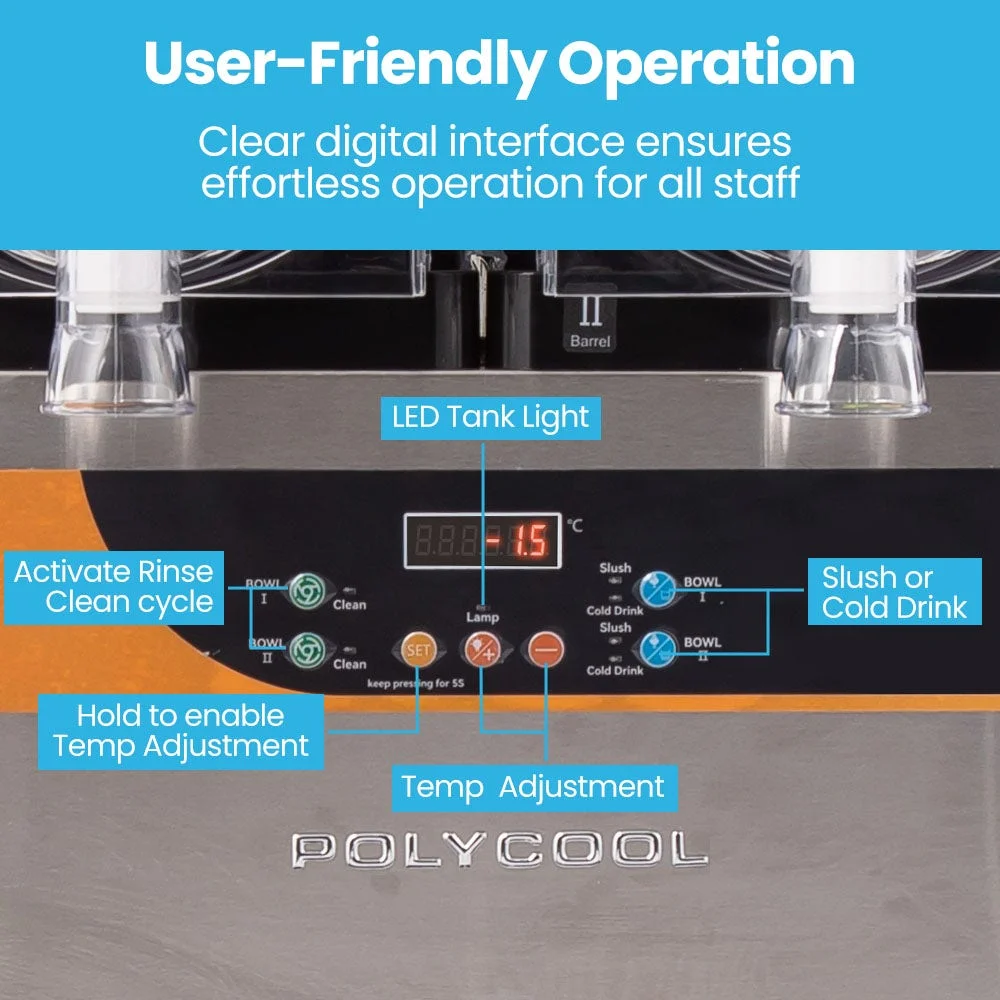 Deliver serious capacity and performance with the POLYCOOL Commercial 24L Twin Tank Slushie Maker. Designed for cafés, restaurants, clubs, food trucks, and party rental businesses, it's built to keep up with busy service while offering flexibility for two flavours at once. The powerful 850W compressor and twin dual-beater system ensure fast, consistent freezing and a smooth, even texture in as little as 50 minutes, ideal for venues serving steady customer flow and repeat orders.
