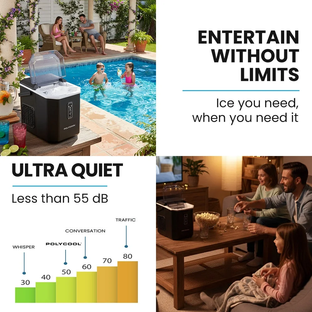 Enjoy a steady supply of ice without taking up valuable space. This PolyCool compact ice maker delivers up to 12kg of ice per day, giving you plenty to keep drinks chilled whether at home, in the office, or on holiday. Despite its small footprint, it's designed for efficiency, producing a fresh batch of ice in as little as 6 to 13 minutes.